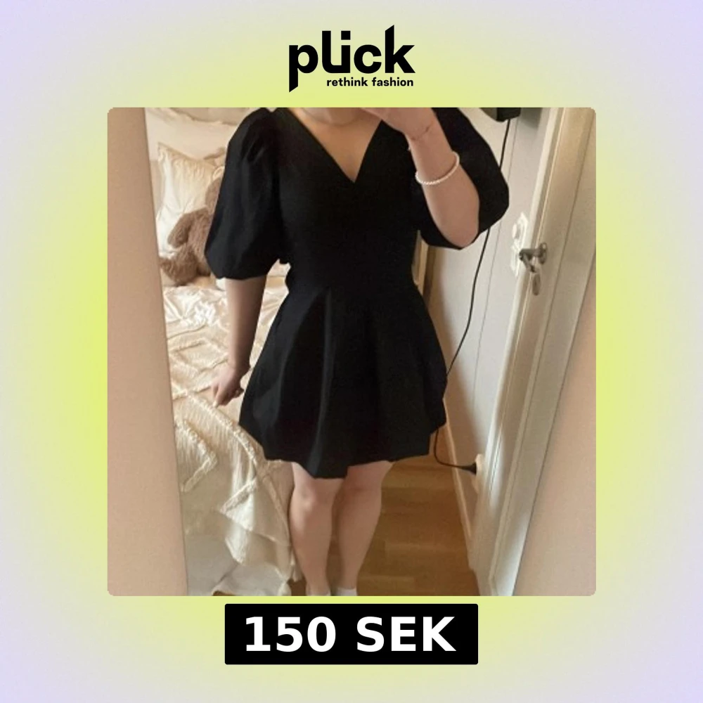 Snygg svart klänning med puffiga kortärmar och v-ringning. Den har en knytning i ryggen som ger en fin detalj. Perfekt för en stilren look.