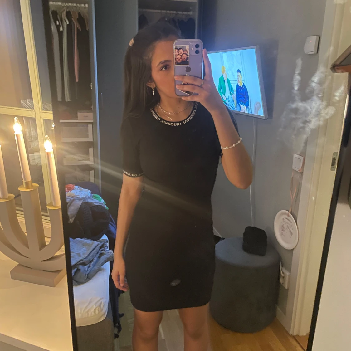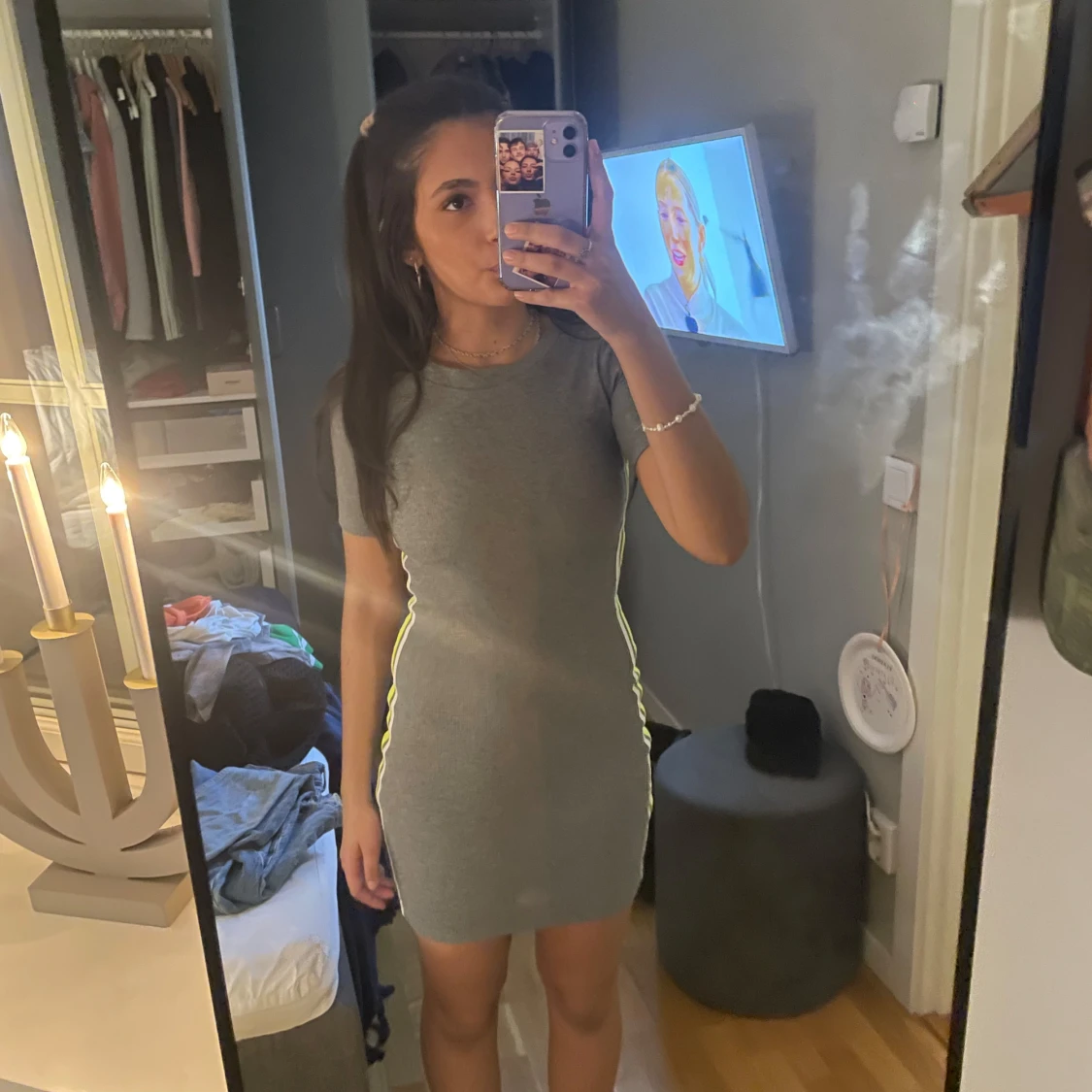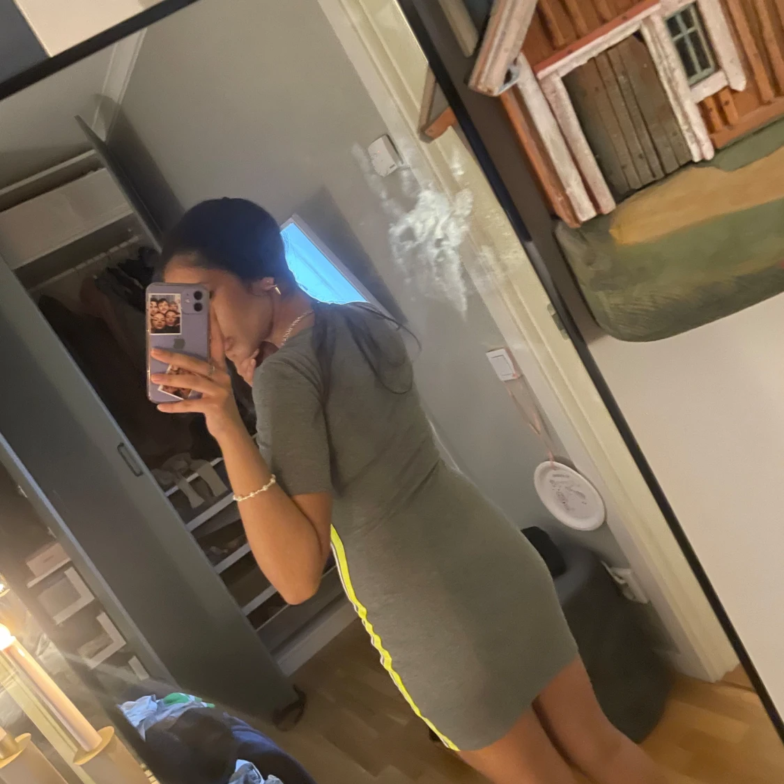 Snygg grå klänning med kort ärm och gula ränder längs sidorna. Perfekt för en avslappnad stil med en touch av färg. Klänningen har en tight passform som framhäver figuren. Det är två stycken 75 styck o 120 för båda