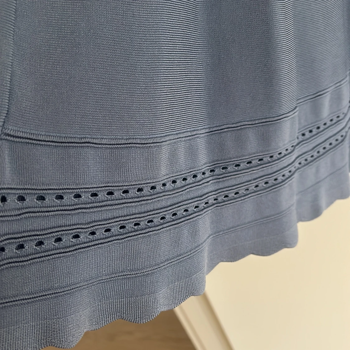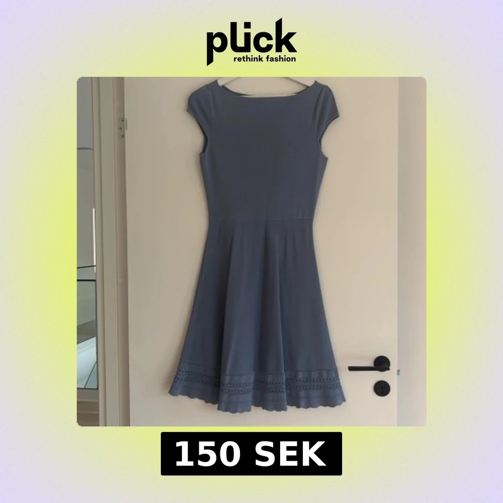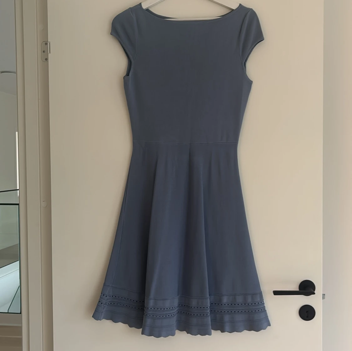 Säljer en ljusblå klänning från H&M med rund halsringning och korta ärmar. Klänningen har en utställd kjol med dekorativa håldetaljer och vågig kant nertill. Perfekt för vår och sommar!