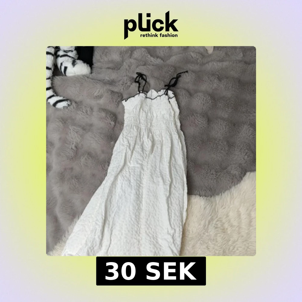 Säljer en söt vit långklänning från H&M med smock upptill och svarta knytband vid axlarna. Klänningen har en lätt skrynklig struktur och svarta detaljer längs kanten. Perfekt för varma dagar!