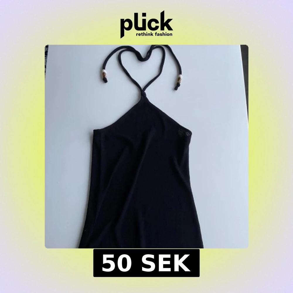 Snygg svart klänning från H&M Divided med halterneck-design och dekorativa pärlor på banden. Perfekt för en stilren look. Klänningen är ärmlös och har en enkel, elegant stil.