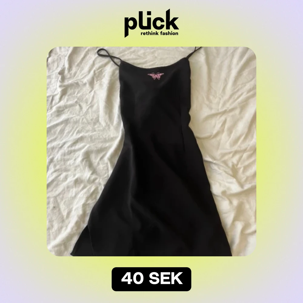En svart kort klänning med öppen rygg och en rosa fjäril på framsidan.