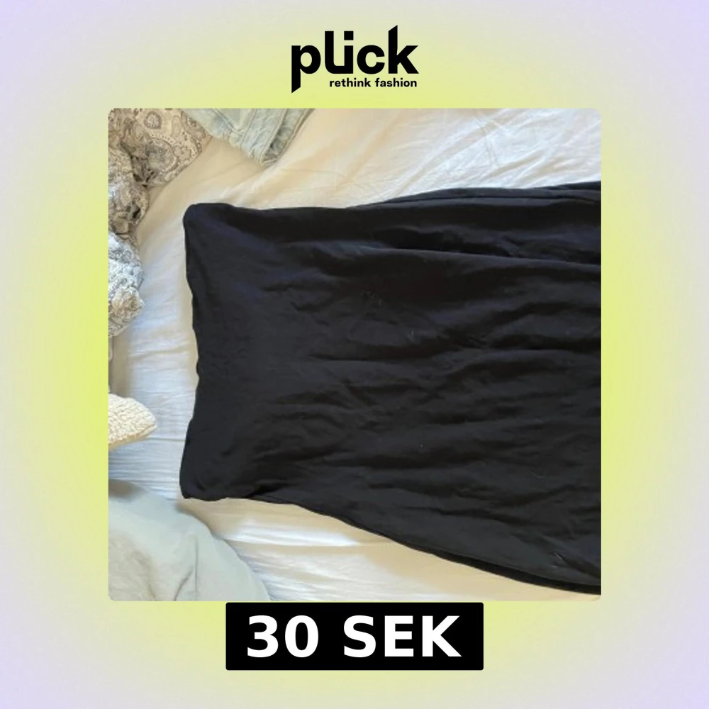 Svart klänning. Storlek L. Från h&m. Bra skicka, använd få gånger. Säljer pga fel storlek. Axelbandslös med resår samt dubbeltyg vid bröstet.
