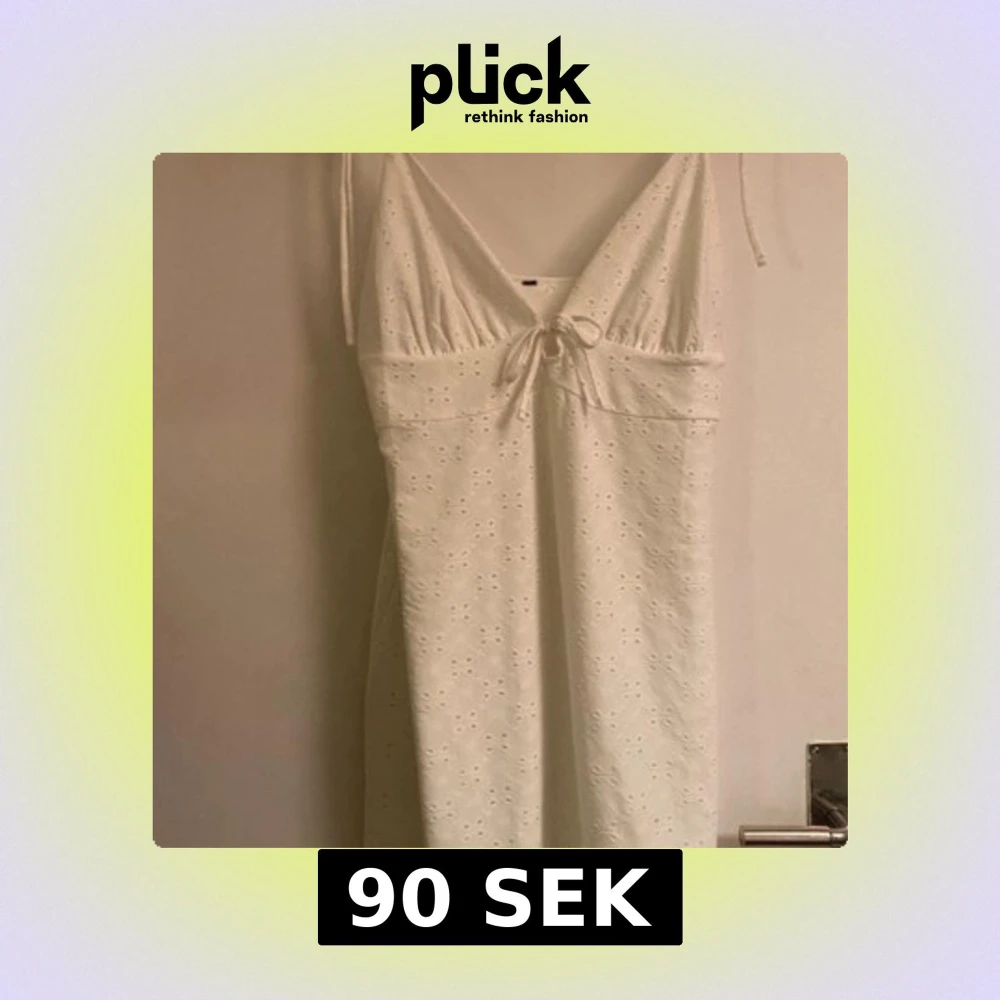 Superfin vit kortklänning med broderade hålmönster och smala axelband. V-ringad framtill med söt knytning under bysten. Perfekt för varma dagar och har en lätt och luftig känsla.