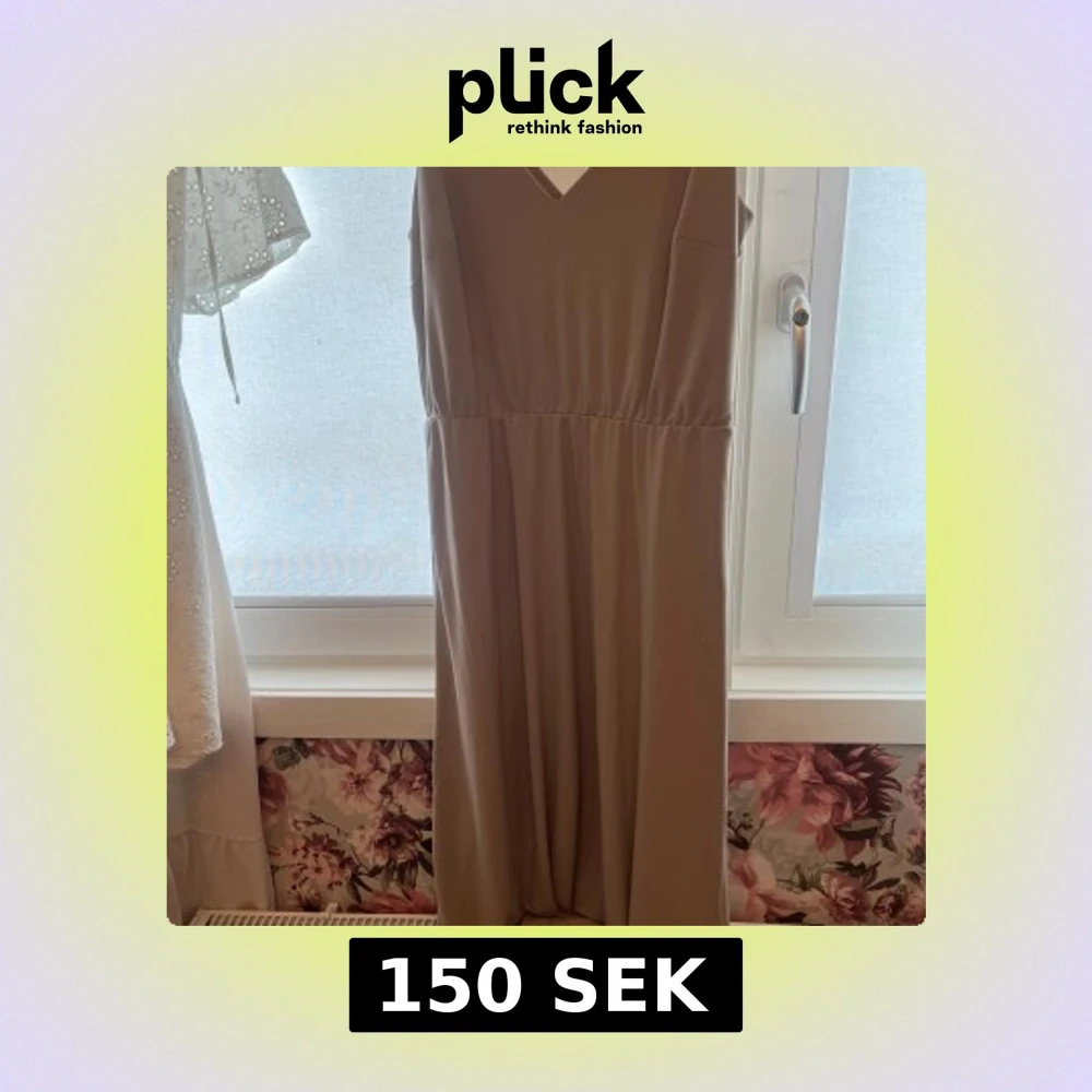 Säljer en stilren beige långklänning med v-ringad hals och ärmlös design. Klänningen har en markerad midja och ett mjukt, fallande tyg som ger en avslappnad men elegant look. Perfekt för dig som gillar minimalistisk stil.