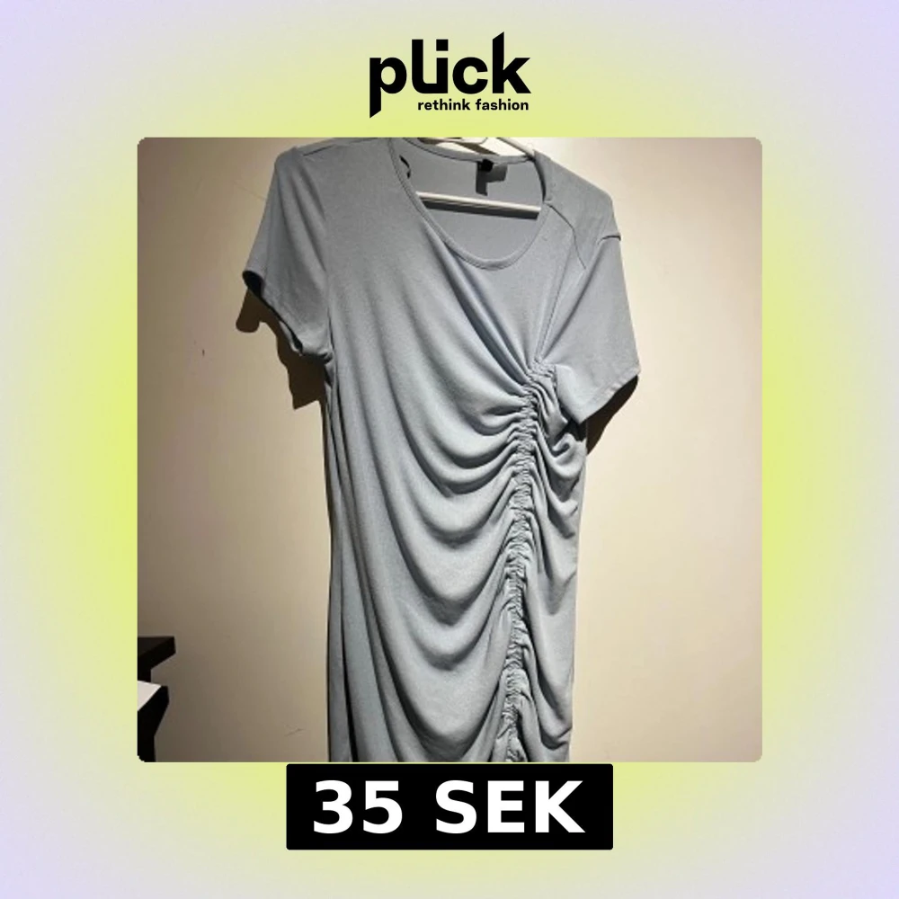 Snygg ljusblå klänning med korta ärmar och en cool rynkdetalj längs sidan som ger en unik look. Perfekt för en avslappnad stil med en twist. Klänningen har en rund hals och är gjord i ett mjukt material för extra komfort.