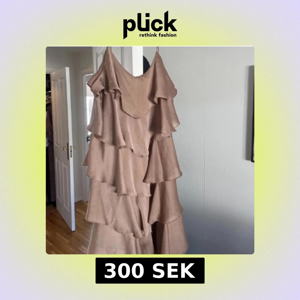 Supersöt beige långklänning med flera lager volanger och smala axelband. Klänningen har en flowy och luftig känsla, perfekt för varma dagar. Materialet känns lätt och svalt, och volangerna ger en riktigt trendig look. Kan skicka den idag, då är den framme till midsommar!
