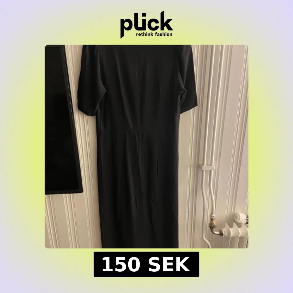Stilren svart långklänning med v-ringning och klädda knappar framtill. Klänningen har korta ärmar och är tillverkad i ett mjukt, lätt material som faller snyggt. Perfekt för dig som gillar minimalistisk och tidlös stil.