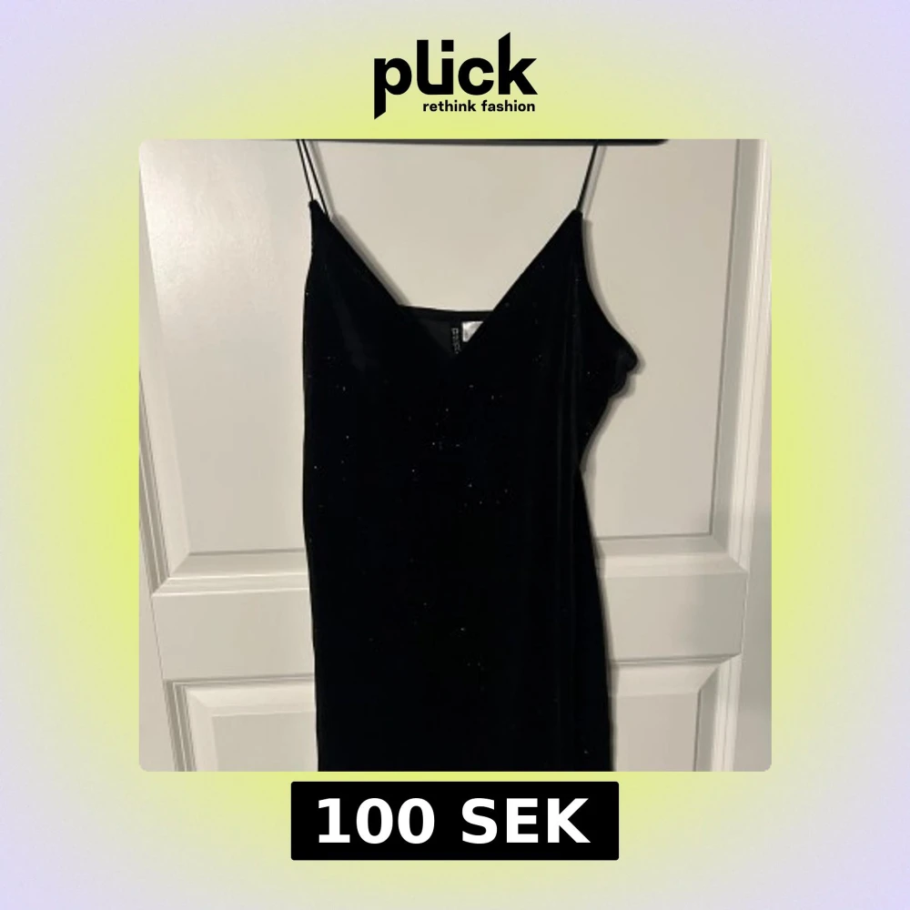 Säljer en svart klänning med smala axelband och diskreta glittriga detaljer. Klänningen har en elegant, figurnära passform och är perfekt för festliga tillfällen.