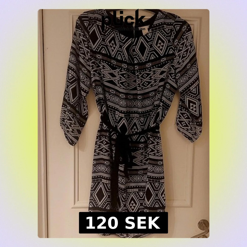 Svartvit kortklänning med grafiskt mönster och trekvartsärm. Klänningen har ett knytband i midjan och rund halsringning. Lätt och luftig modell som ger en avslappnad men snygg look.