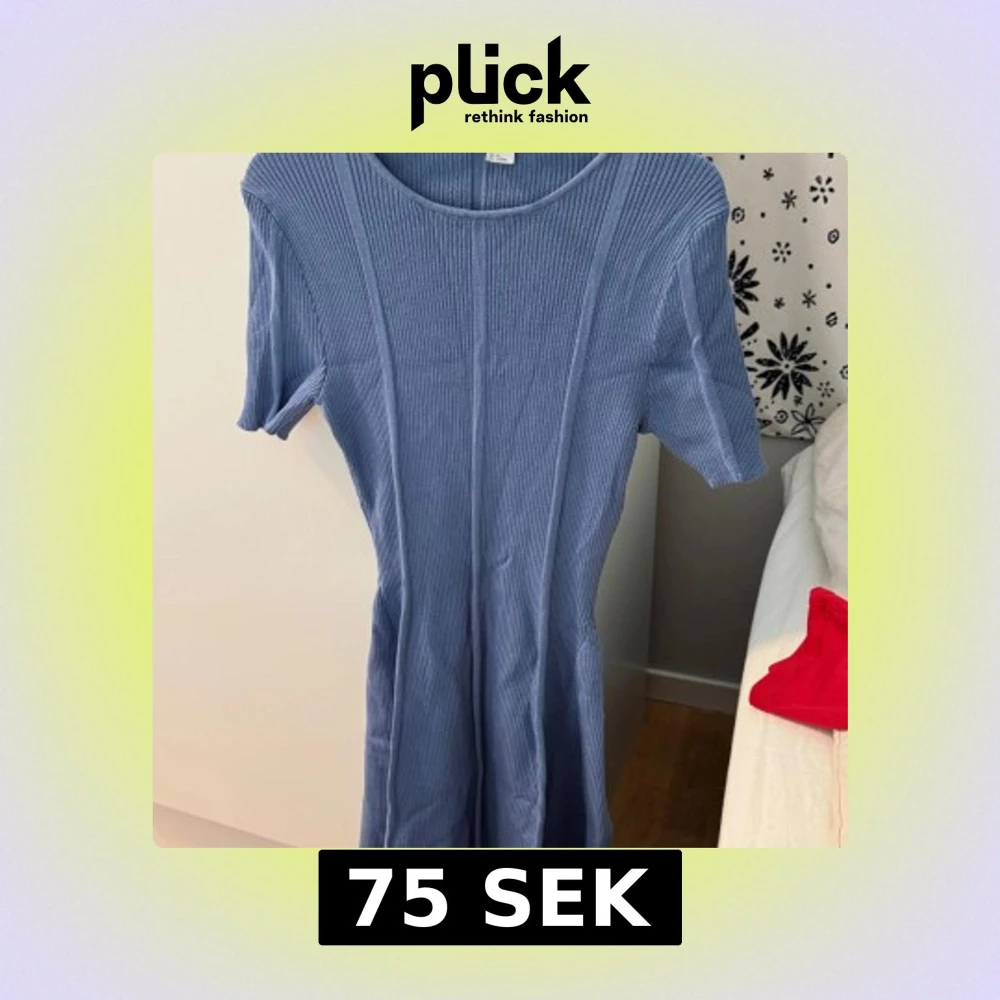 Säljer en blå ribbad kortklänning med rund hals och korta ärmar. Klänningen har en slim passform och vertikala sömmar som ger en snygg siluett. Materialet är mjukt och stretchigt, perfekt för dig som gillar enkel och stilren design.