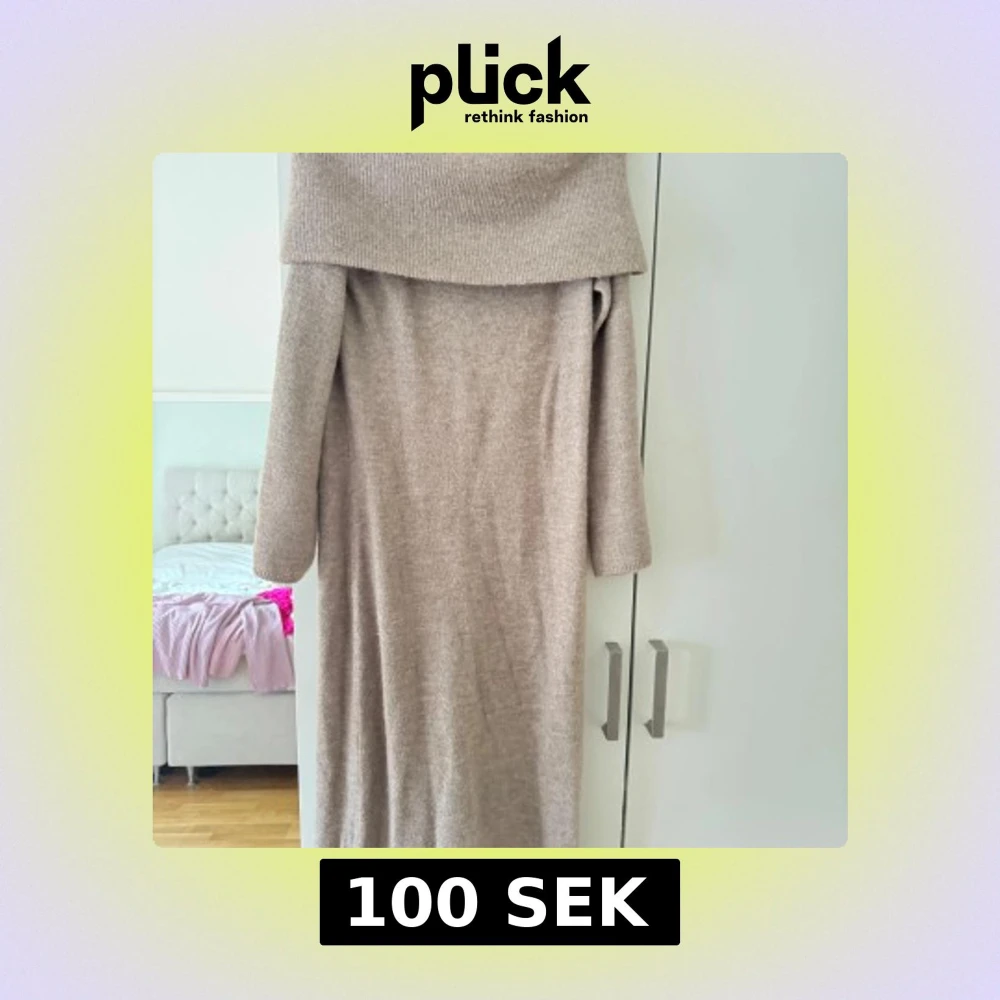 Mysig beige stickad långklänning med bred offshoulder-krage och långa ärmar. Klänningen har en rak och avslappnad passform, perfekt för dig som gillar en enkel men ändå trendig look. Materialet är mjukt och värmande, perfekt för kyligare dagar.