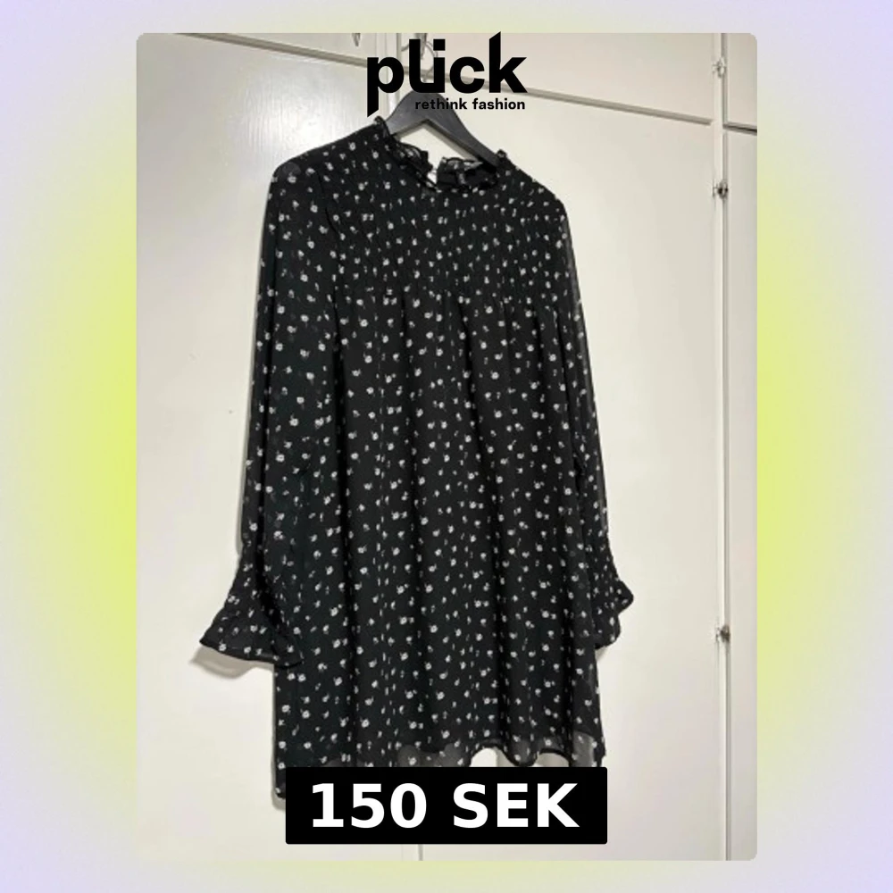 Söt svart kortklänning med små vita blommor och volangdetaljer vid ärmslut och hals. Klänningen har lång ärm och lätt rynkad överdel för en avslappnad passform. Perfekt för dig som gillar en romantisk och trendig stil.
