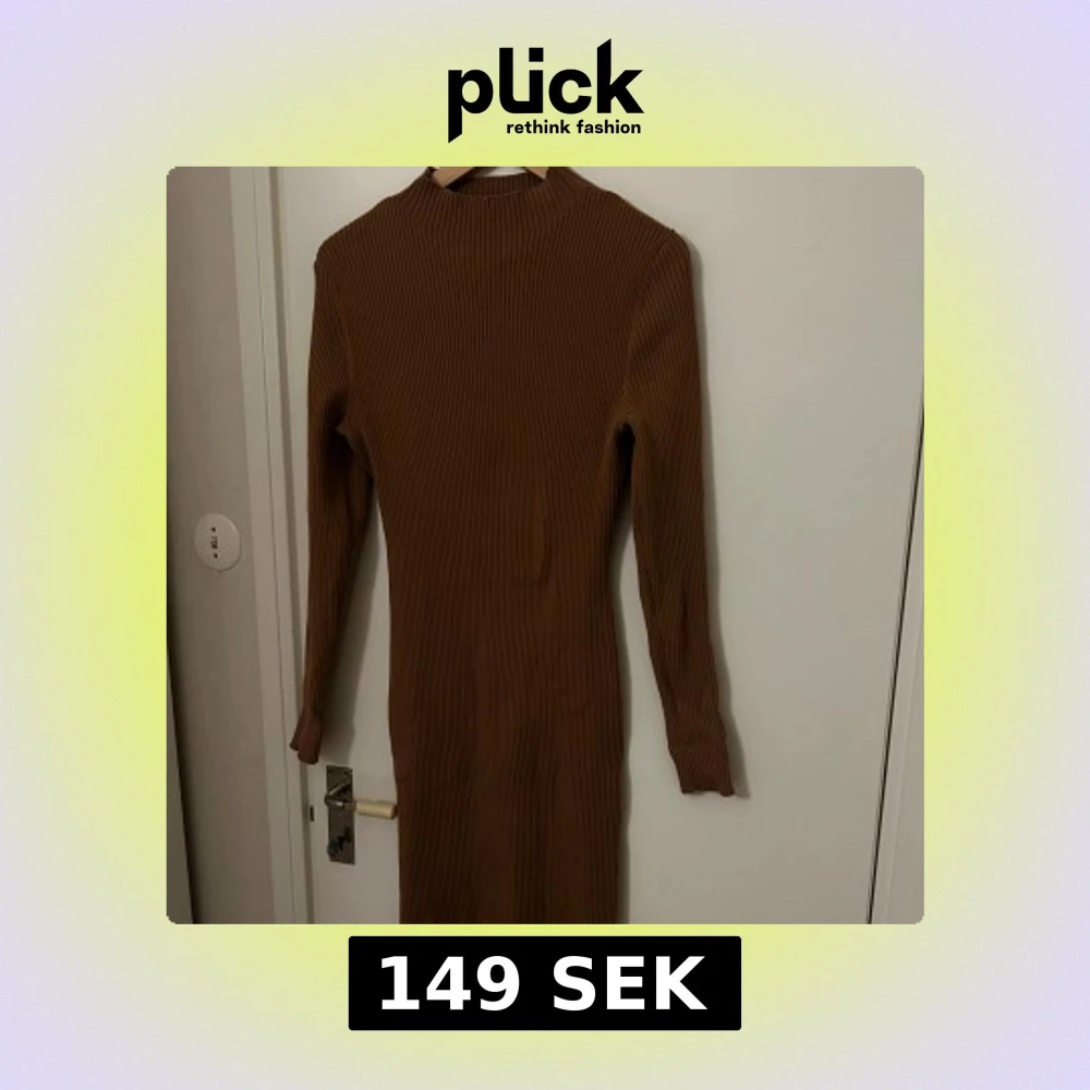 Säljer en brun ribbad långklänning med lång ärm och hög hals. Materialet är mjukt och stretchigt, vilket gör den både bekväm och stilren.