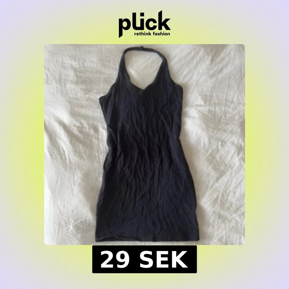 Snygg svart halterneck klänning med v-ringad hals och figurnära passform. Klänningen är kort och ärmlös, perfekt för dig som gillar en enkel och stilren look. Materialet känns mjukt och följsamt mot kroppen.