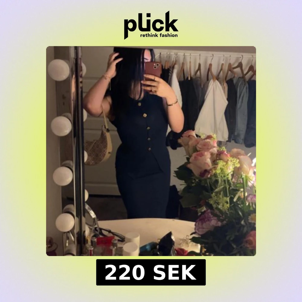 Säljer ett marinblå set i tvådelad look med ärmlös topp och matchande kjol. Toppen har dekorativa guldiga knappar framtill och rund halsringning. Materialet är mjukt och stretchigt, perfekt för en stilren och enkel look.