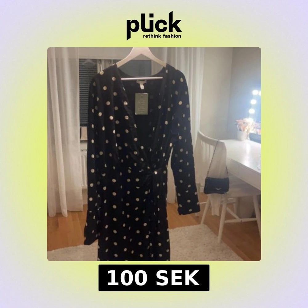 Svart omlottklänning från H&M i storlek M med vita prickar. Klänningen har lång ärm, v-ringning och knyt i midjan för en snygg siluett. Perfekt för dig som gillar klassiska mönster och vill ha en klänning som sticker ut lite extra. Hör gärna av er vid frågor eller funderingar! 💖