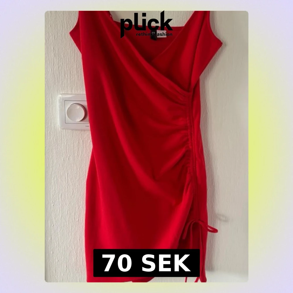 Snygg röd kortklänning med omlott-design och snörning i sidan. Klänningen har v-ringning och är ärmlös, vilket ger en trendig och ungdomlig look. Perfekt för dig som vill sticka ut med en färgstark outfit.