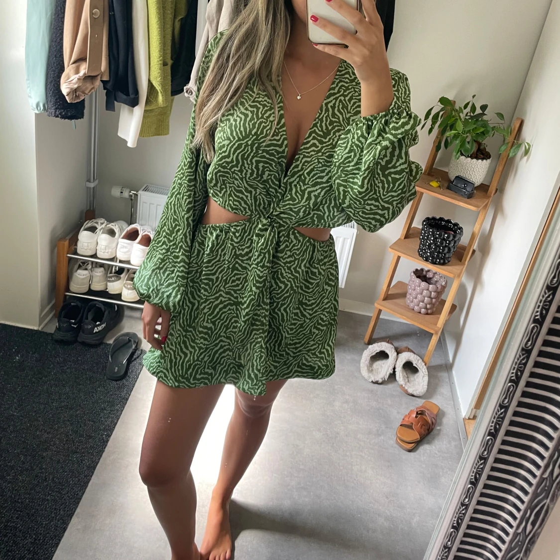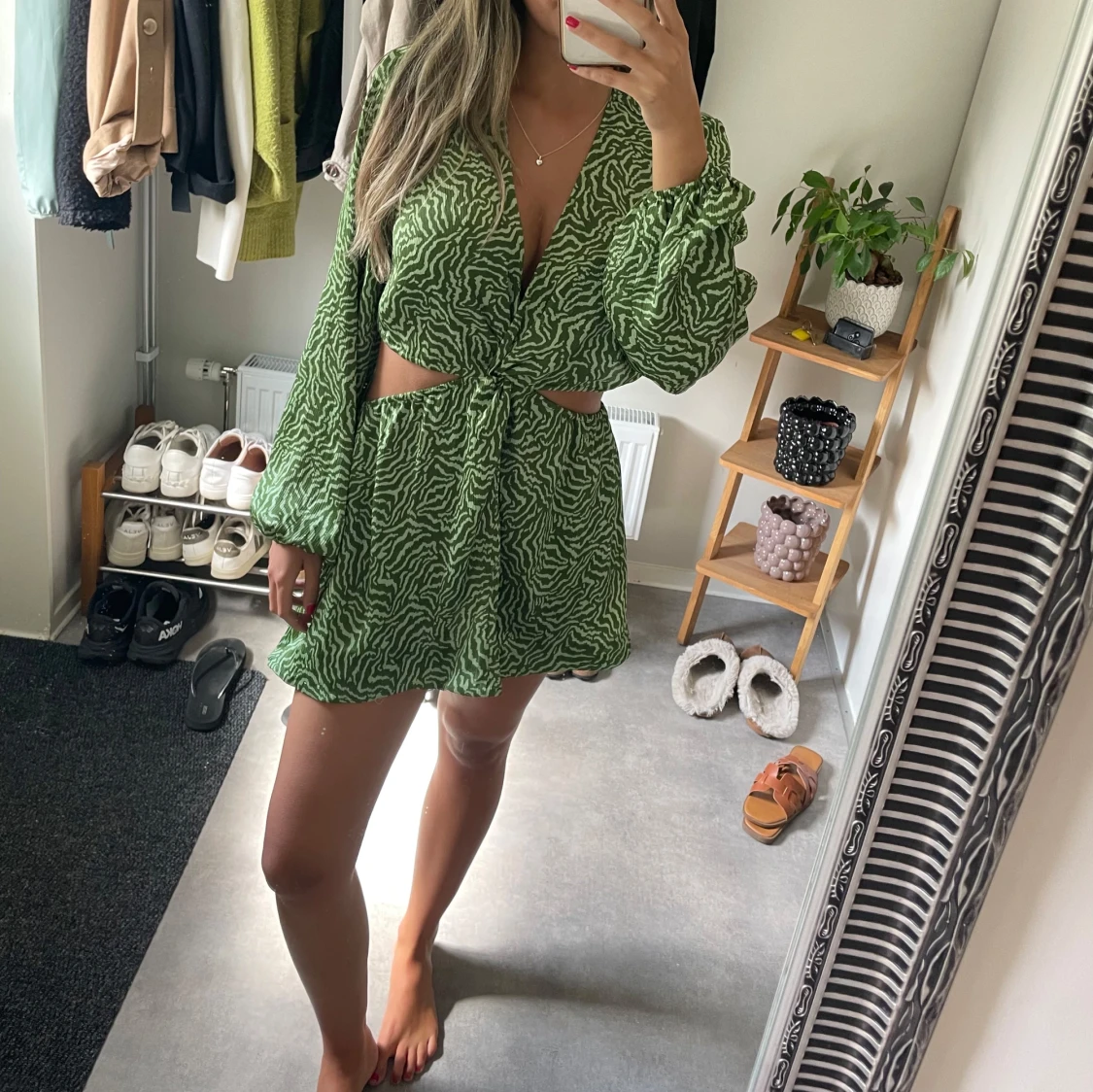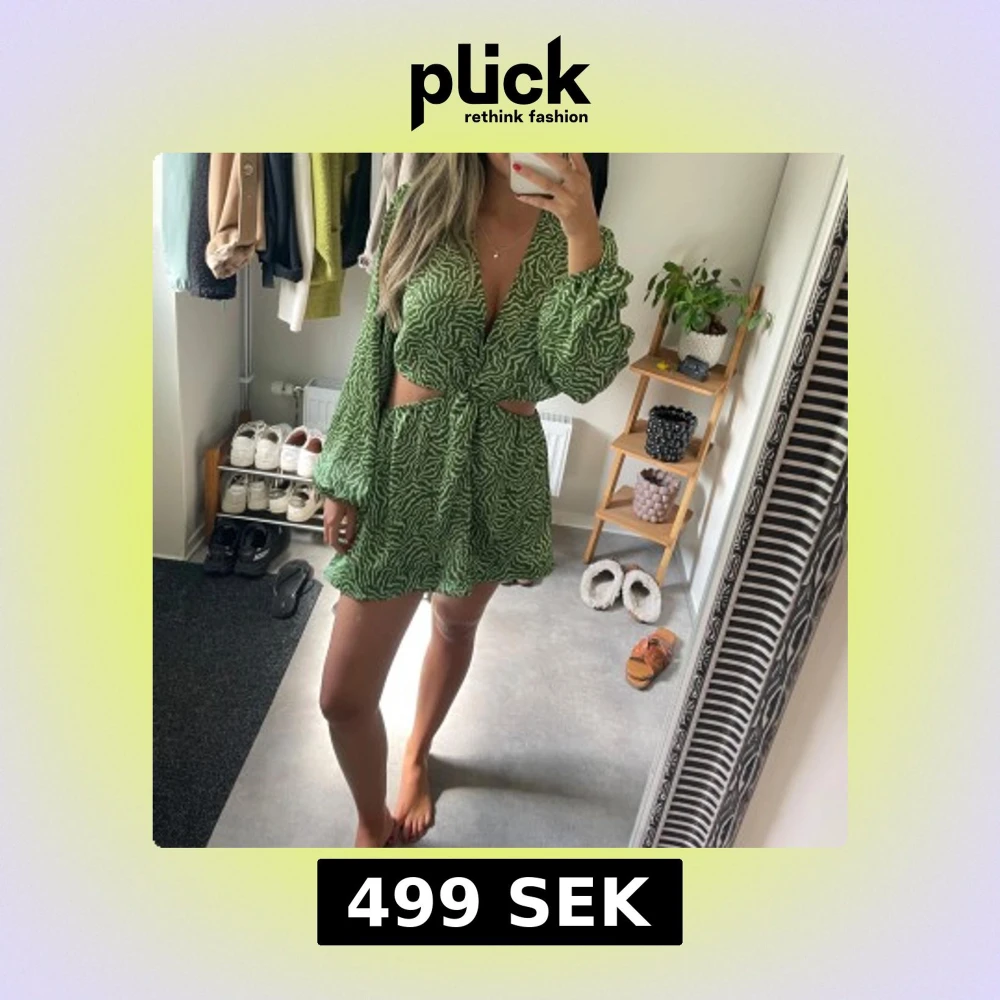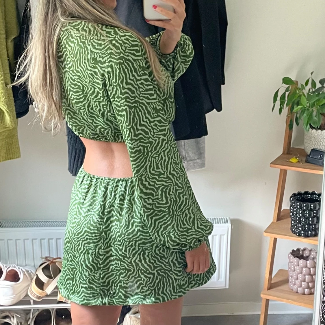 Säljer en grön kortklänning med vitt zebramönster. Obs sytt upp klänningen själv!!