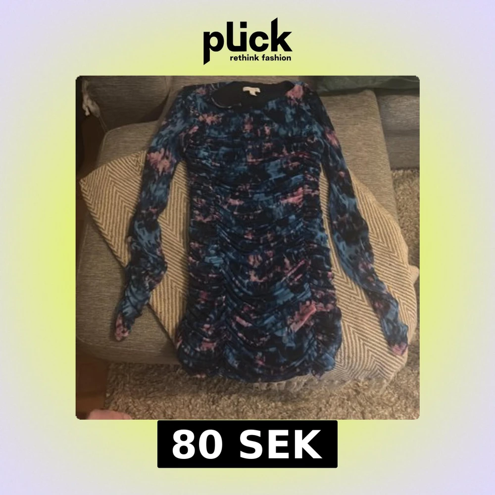 Säljer en cool kort klänning från H&M i storlek L , jag tycker den är mer åt M med blått och rosa abstrakt mönster. Klänningen har lång ärm, rynkade detaljer framtill och är figurnära. Materialet känns mjukt och stretchigt, perfekt för dig som gillar att sticka ut med färg och form.