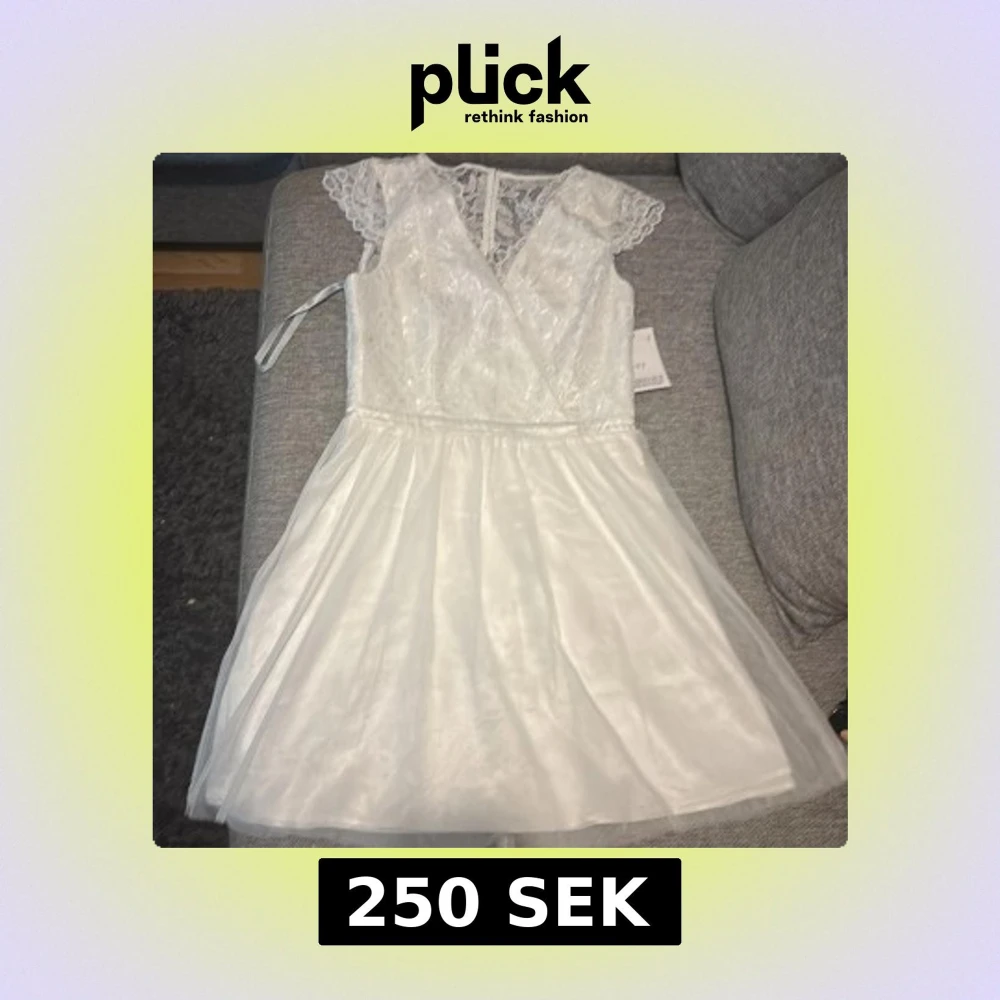 ( liten fläck)Superfin vit kortklänning med spets upptill och omlott-v-ringning. Kjolen är i tunt, glansigt material och klänningen har små knappar i ryggen. Perfekt för student eller sommarens alla tillfällen! Liten fläck men går lätt bort med vanish bara jag som har för många plagg och svårt med tiden som inte räcker:)