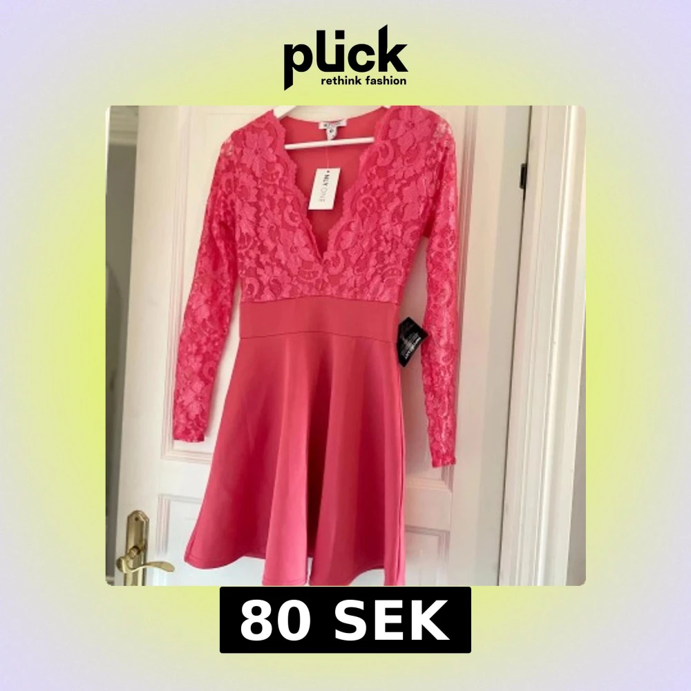 Ny rosa klänning från Nelly med långärmad spetsöverdel och djup v-ringning. Kjolen är slät och har en lätt utställd form.