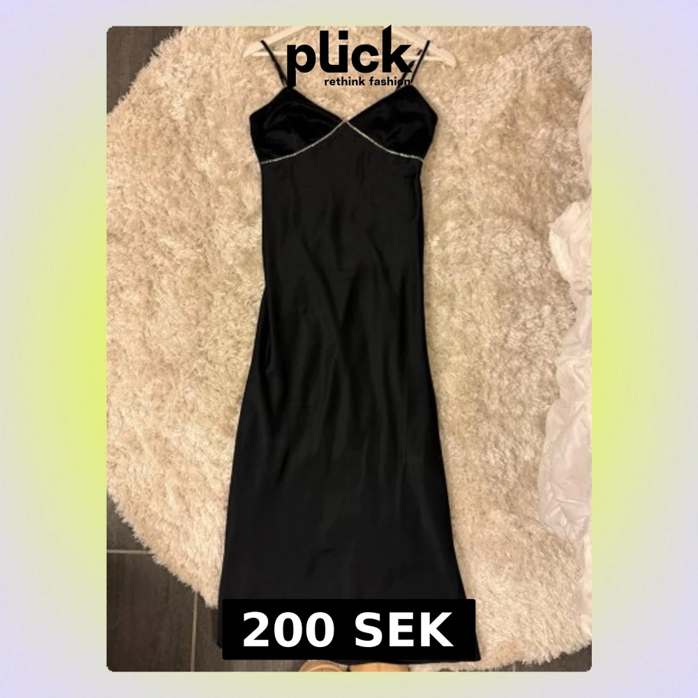 Supersnygg svart lång satinklänning med tunna axelband och glittrande strassdetaljer längs bysten. Se bild för tappade stenar, inget som syns tydligt.