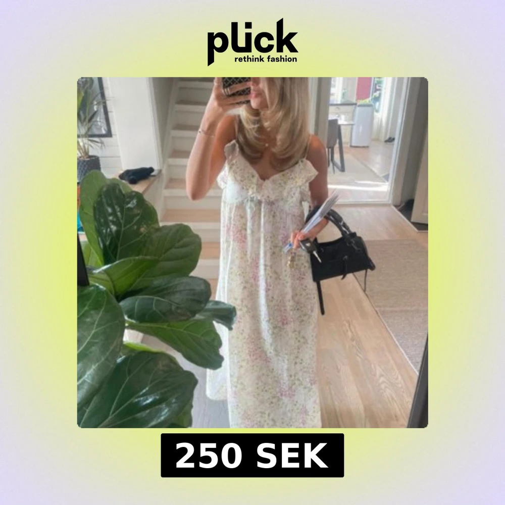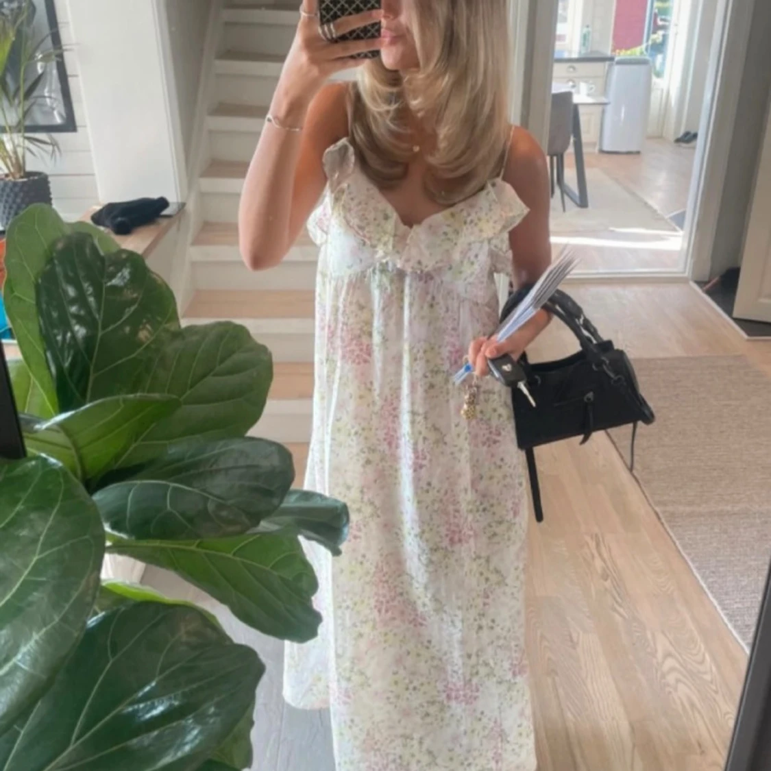 Superfin långklänning med blommigt mönster i ljusa pastellfärger. Klänningen har volangdetaljer vid axelbanden och en luftig passform, perfekt för varma dagar. Tunn och skön i materialet, med romantisk känsla och söt v-ringning.