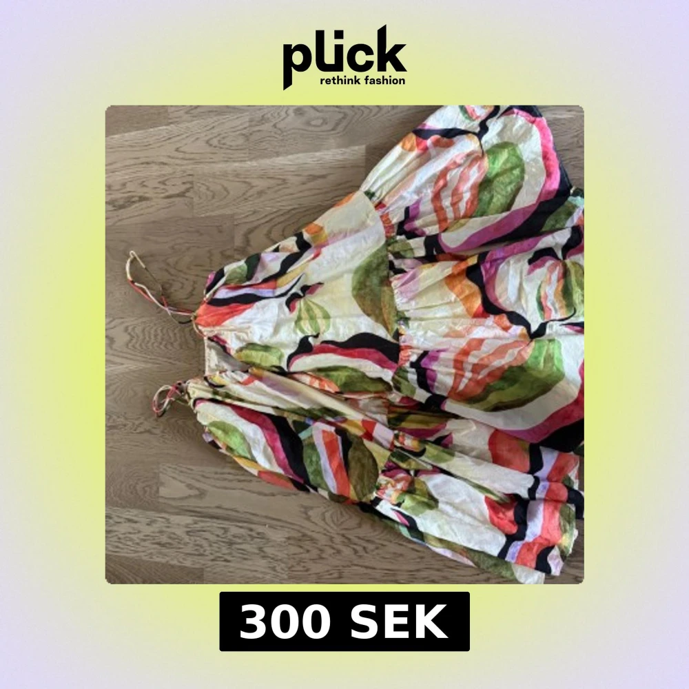 Superfin långklänning från H&M med färgstarkt abstrakt mönster i rosa, orange, grön, svart och vit. Klänningen har tunna axelband, volanger och luftig passform – perfekt för varma dagar och sommarvibbar.
