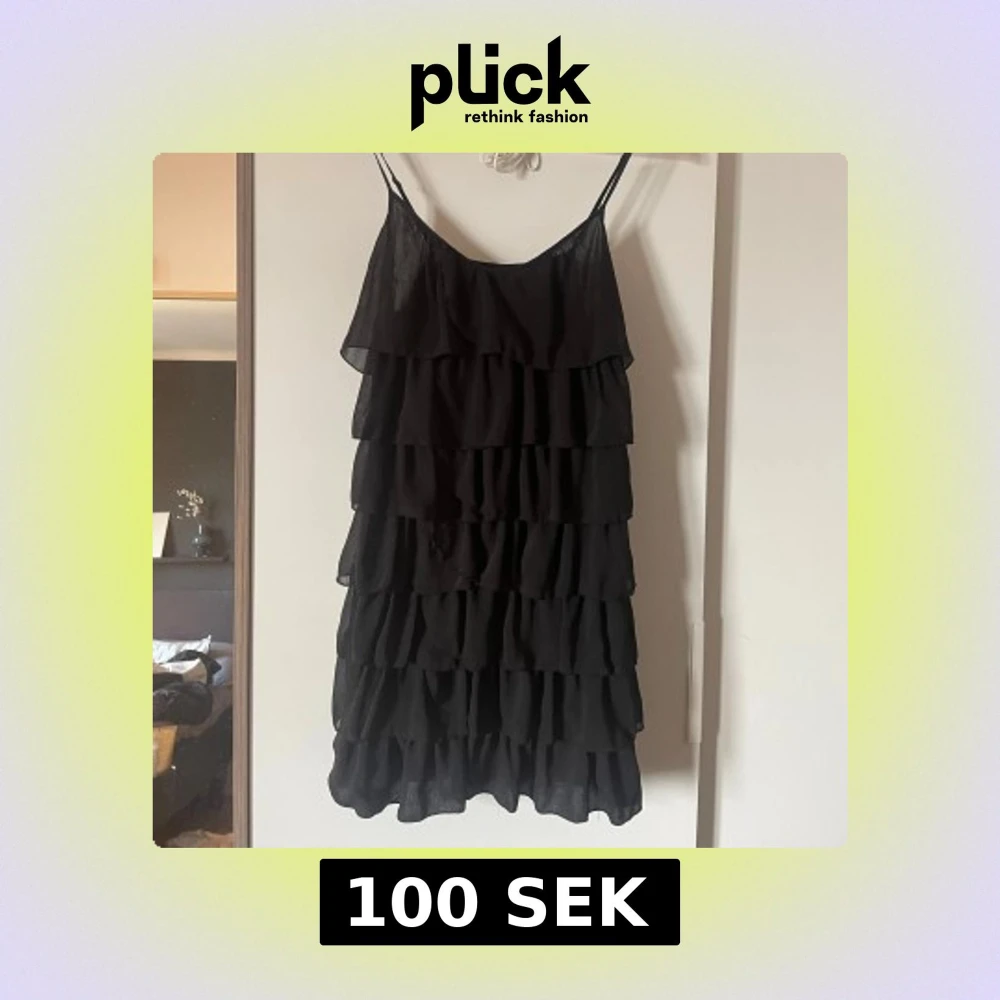 Supersöt svart kortklänning med flera lager volanger och tunna axelband. Perfekt för dig som gillar en lekfull och trendig stil. Lätt och luftig känsla, passar till många olika tillfällen.