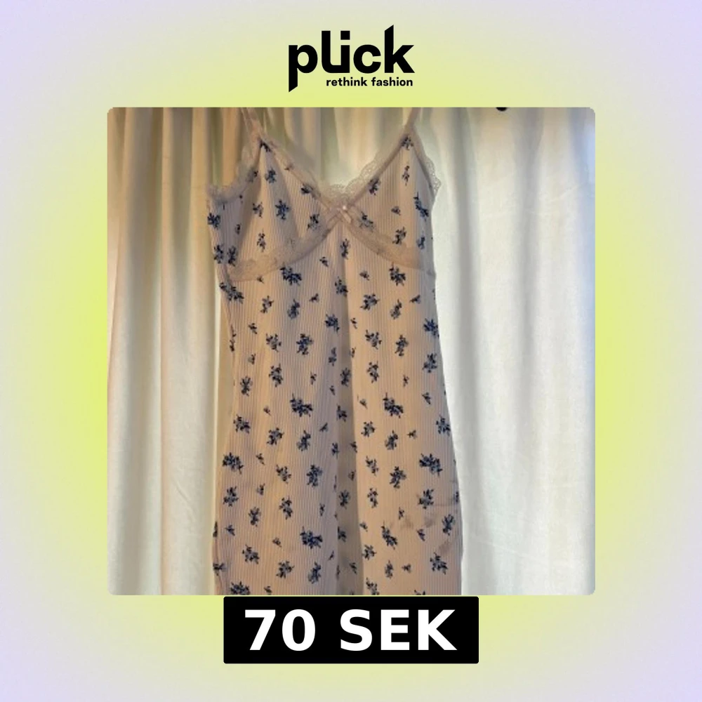 Söt vit kortklänning med blått blommönster och ribbad struktur. Klänningen har smala axelband, spetskant vid urringningen och en liten rosett framtill. Perfekt för sommarens varma dagar.