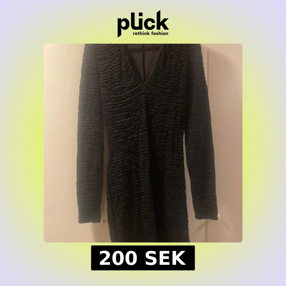 Svart kortklänning från H&M i storlek S med lång ärm och snygg v-ringning. Klänningen har ett coolt rynkat tyg som ger en unik struktur och passar perfekt när du vill sticka ut lite extra.