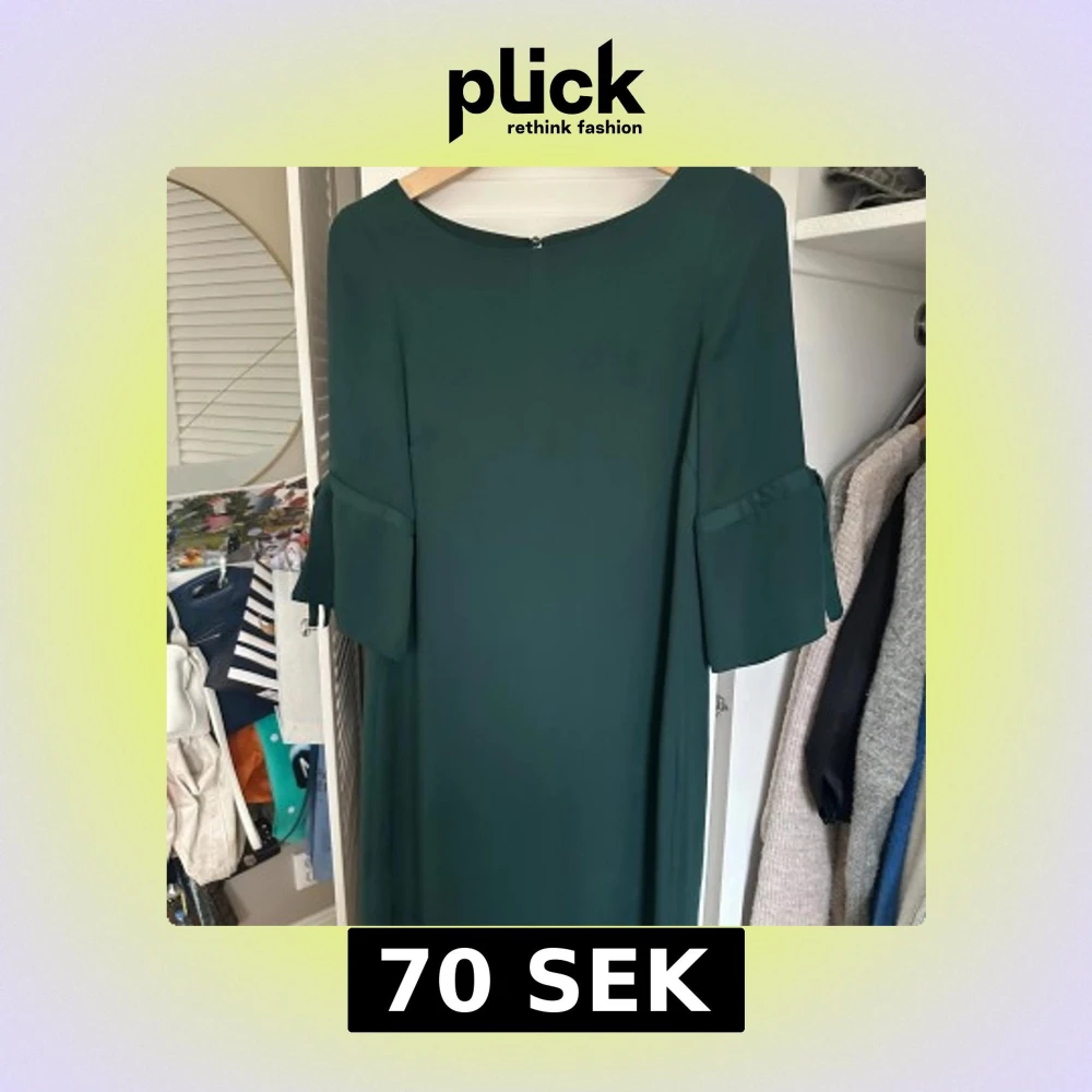Elegant mörkgrön klänning med volangdetaljer på ärmarna. Perfekt för en stilren look. Klänningen har en enkel och klassisk design med rund hals och trekvartsärmar.