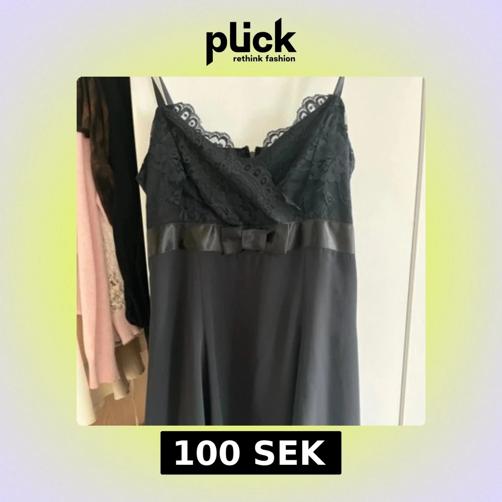 Svart klänning med tunna axelband, spets upptill och en söt rosett i midjan. Överdelen har blommig spets och en satinliknande kant. Perfekt för dig som gillar eleganta detaljer och stilren look.
