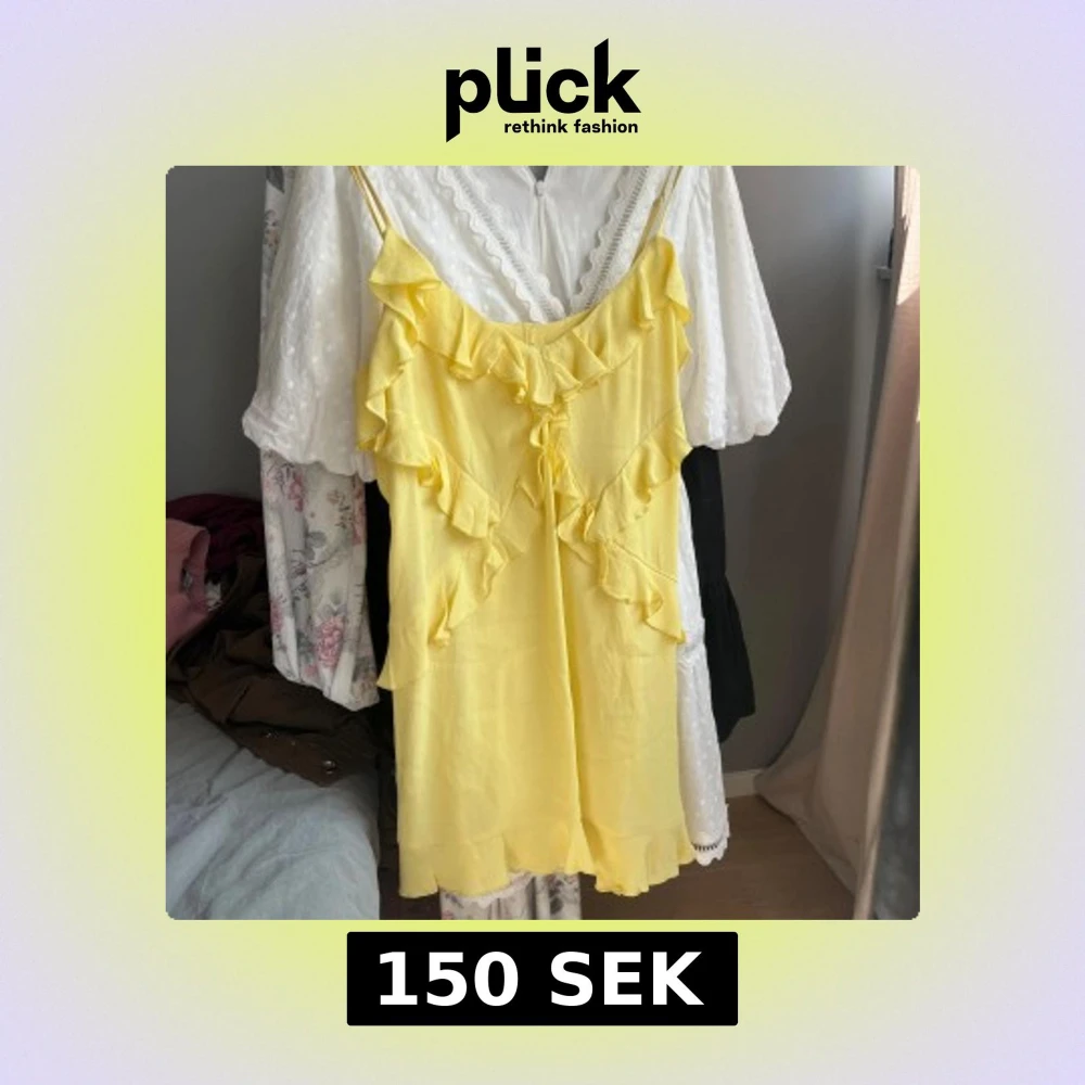 Söt gul kortklänning med smala axelband och volangdetaljer framtill och längs fållen. Perfekt för varma dagar och ger en riktigt somrig vibe. Lätt och luftig känsla, passar dig som gillar färg och lekfull stil.