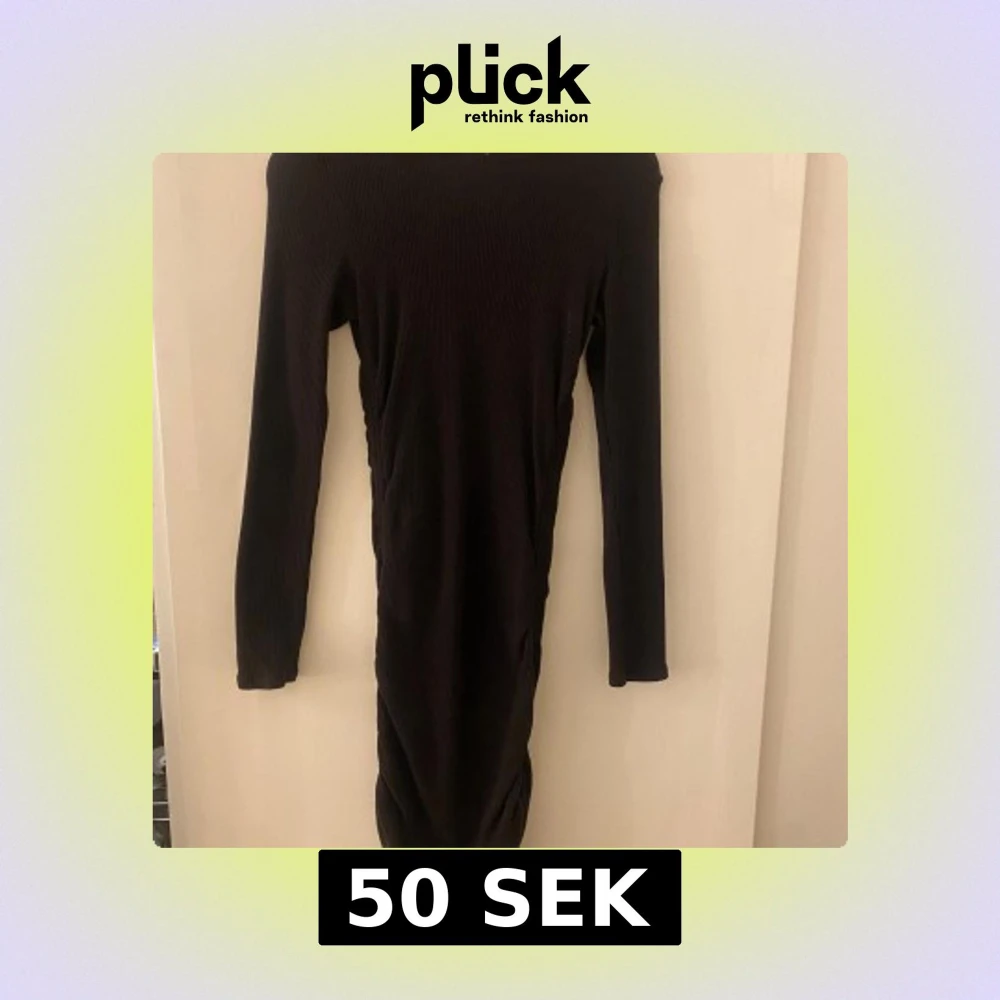 Svart ribbad klänning från H&M i storlek S. Långärmad modell med tight passform och snygg rynkdetalj längs båda sidor.