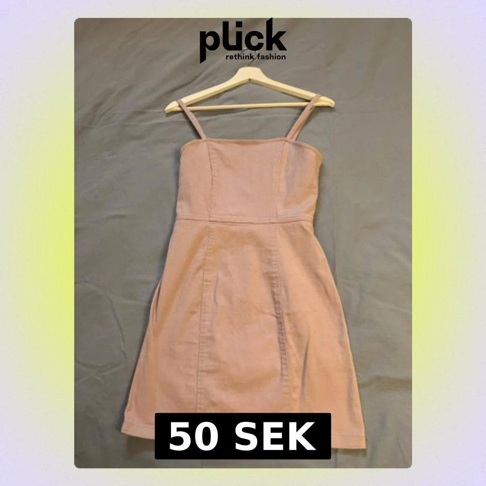 Söt ljusrosa kort klänning med smala axelband och figurnära passform. Klänningen har en rak urringning och en lång dragkedja i ryggen som detalj. Tillverkad i jeans material som ger en trendig känsla.