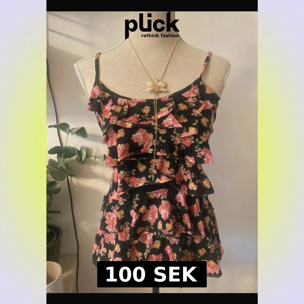 Supersöt kort klänning med svart botten och blommigt mönster i rosa och gult. Klänningen har smala axelband, flera volanger framtill och figurnära passform. Perfekt för dig som gillar romantisk och lekfull stil.