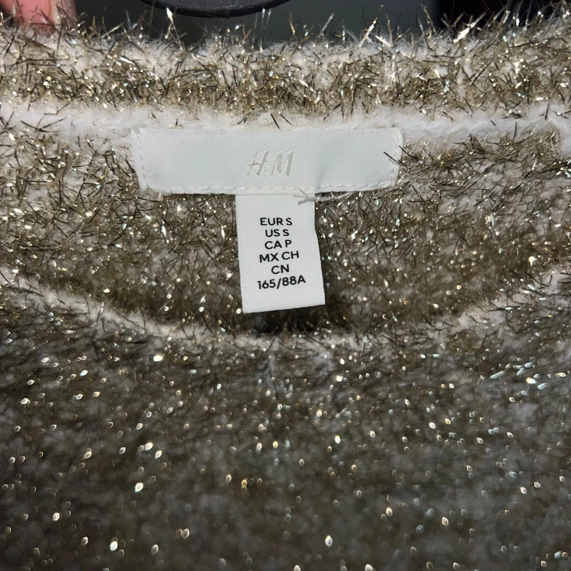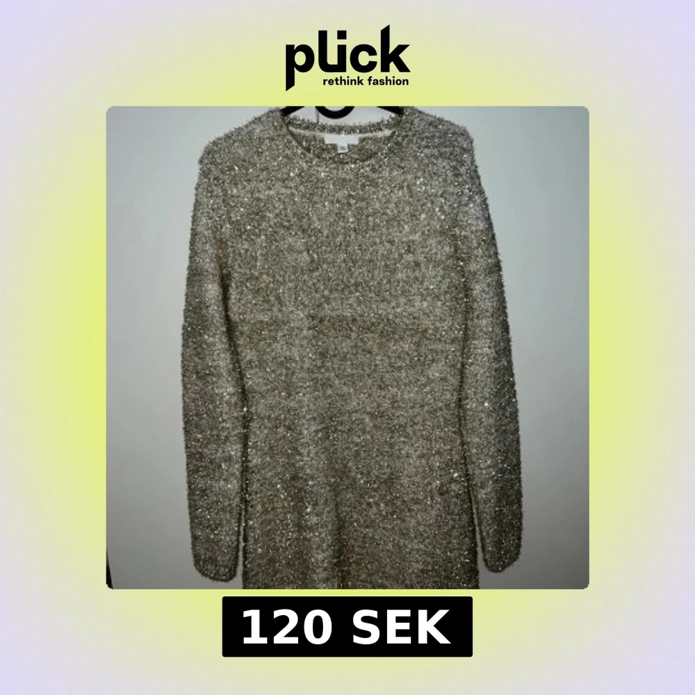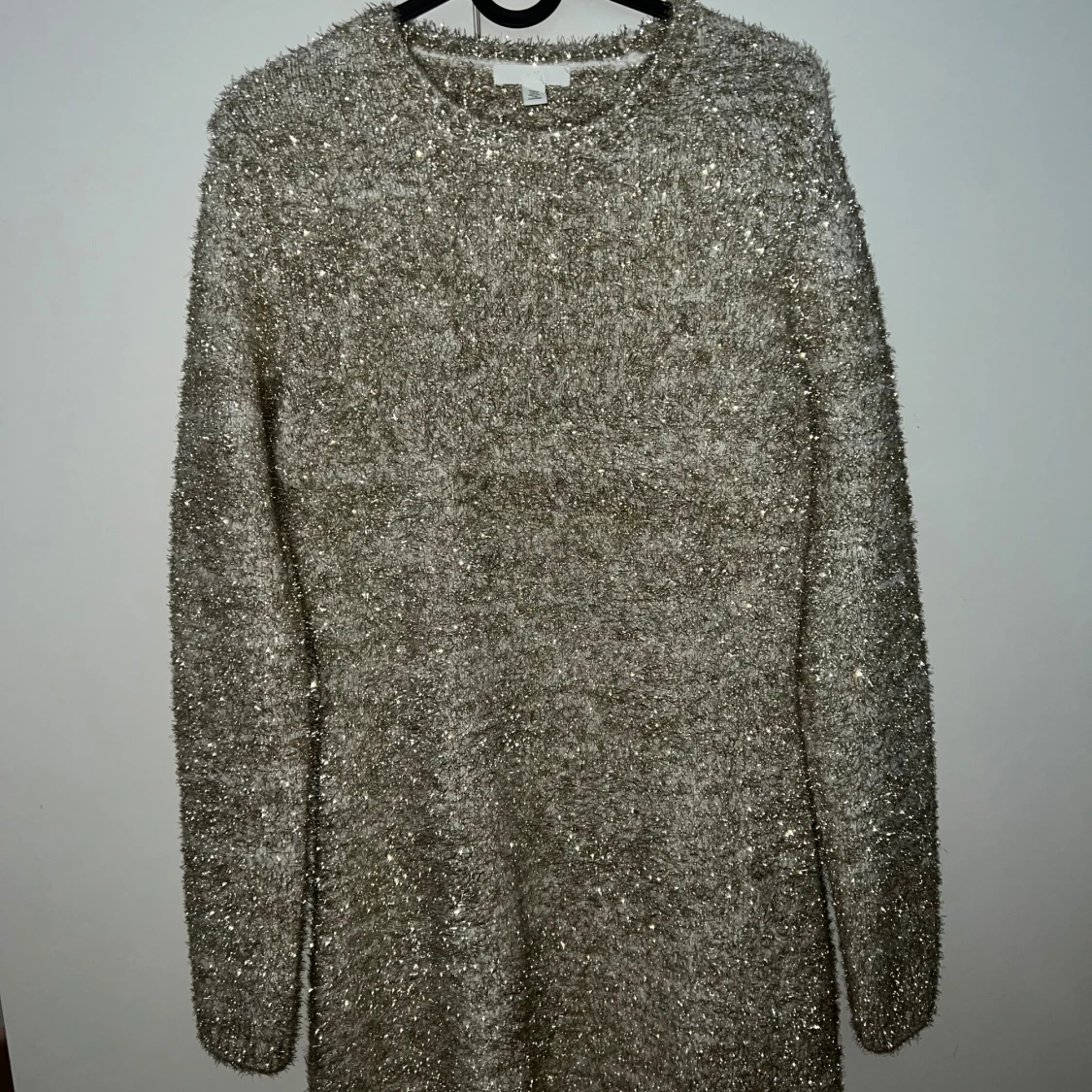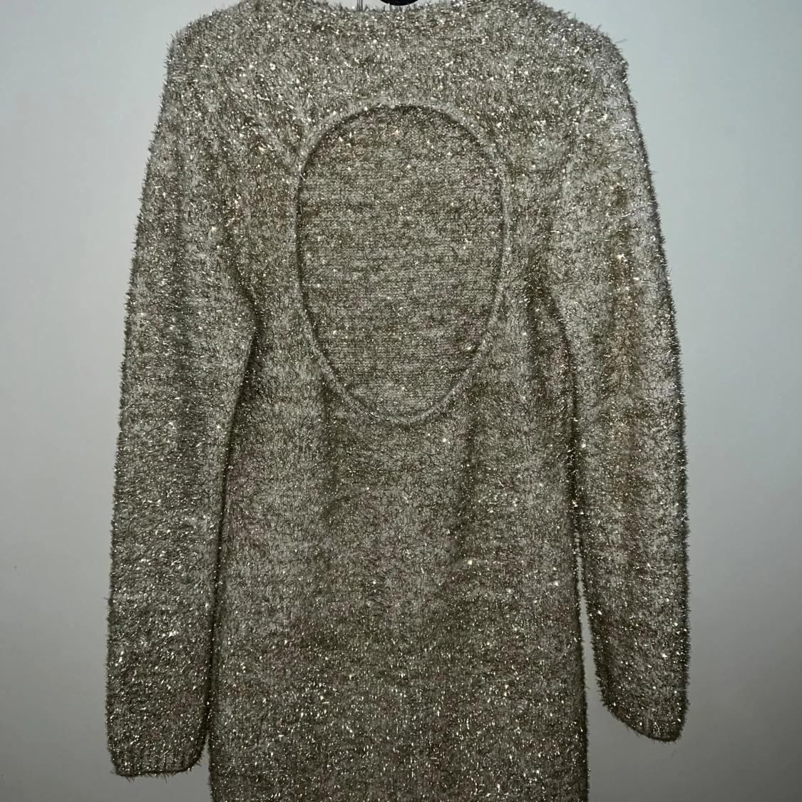 Superfin glittrig stickad klänning från H&M i beige och silver. Klänningen har lång ärm, kort längd och en snygg öppen rygg. Perfekt för dig som vill sticka ut med en mysig men ändå glam look. Materialet är mjukt och skimrande med glittertrådar.