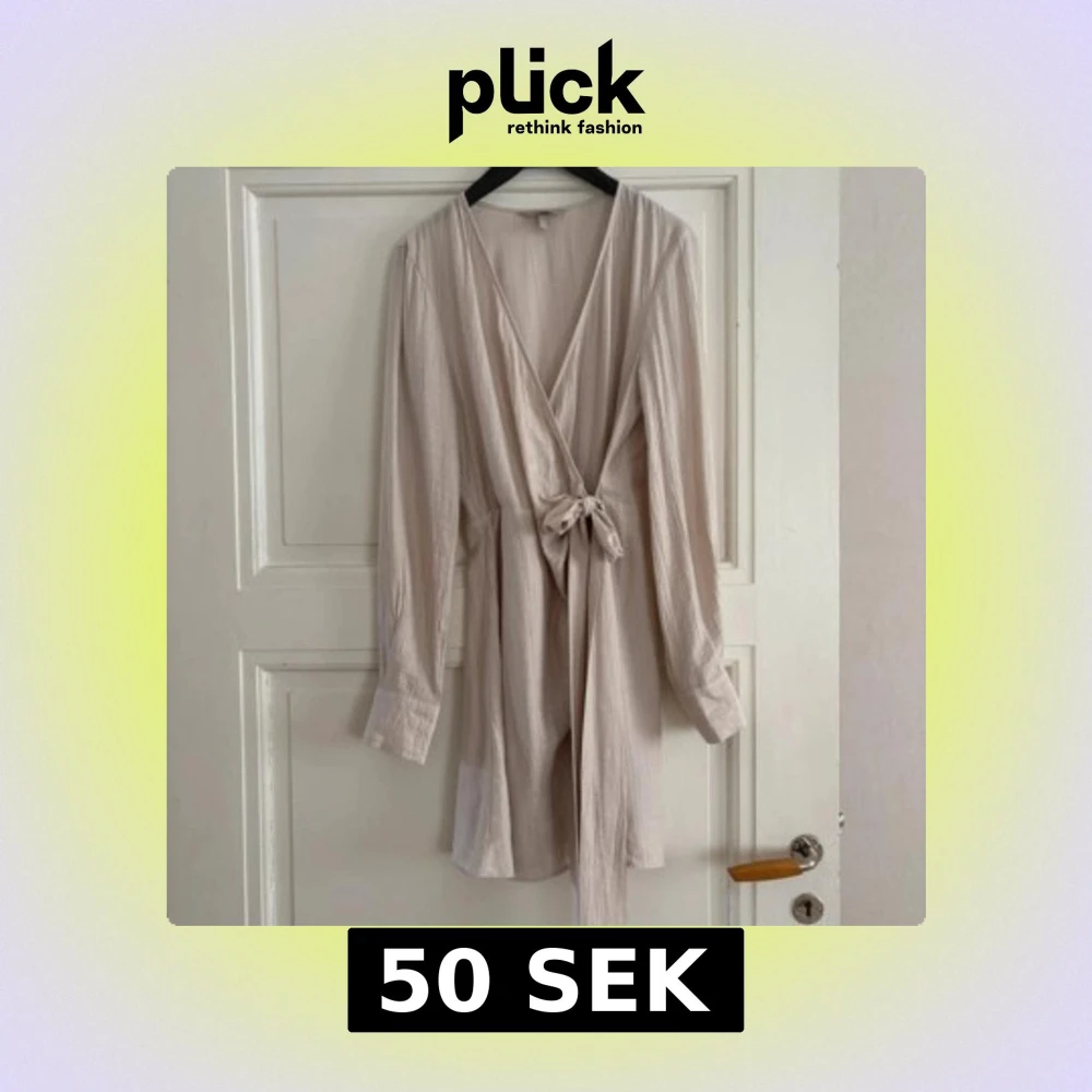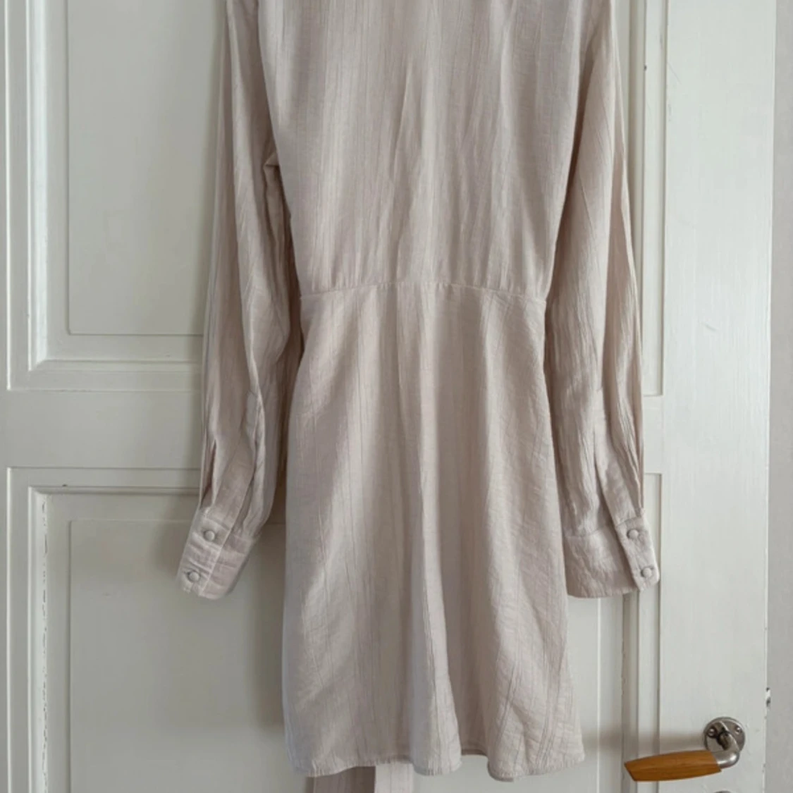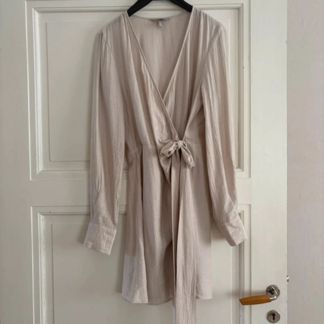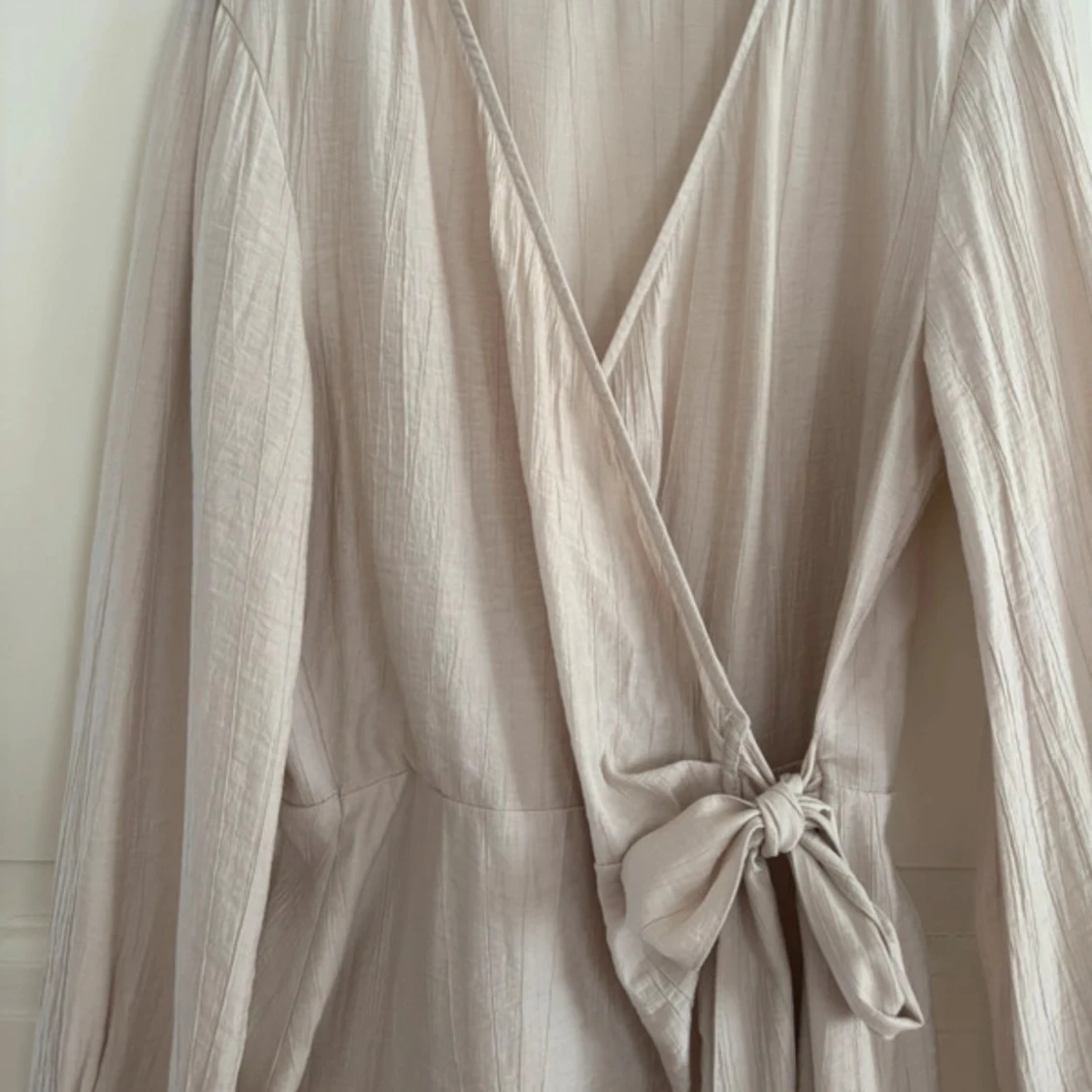 Superfin beige kort omlottklänning med lång ärm och knyt i midjan. Klänningen har v-ringning och är gjord i ett mjukt, lätt bomullstyg med diskret struktur. Perfekt för dig som gillar en enkel men stilren look.