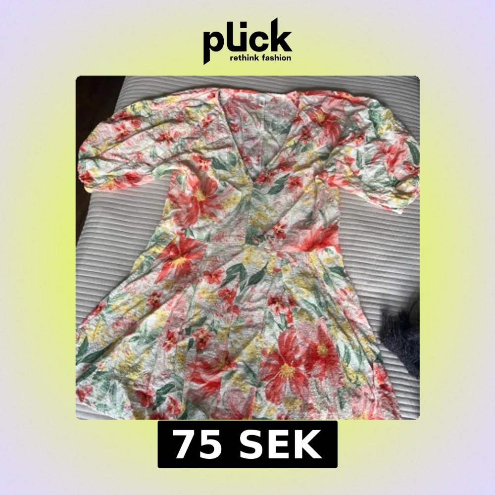 Superfin kortklänning från H&M med färgglatt blommönster i rött, gult och grönt på vit botten. Klänningen har v-ringning, puffiga korta ärmar och lätt utställd kjol. Perfekt för sommarens alla tillfällen!