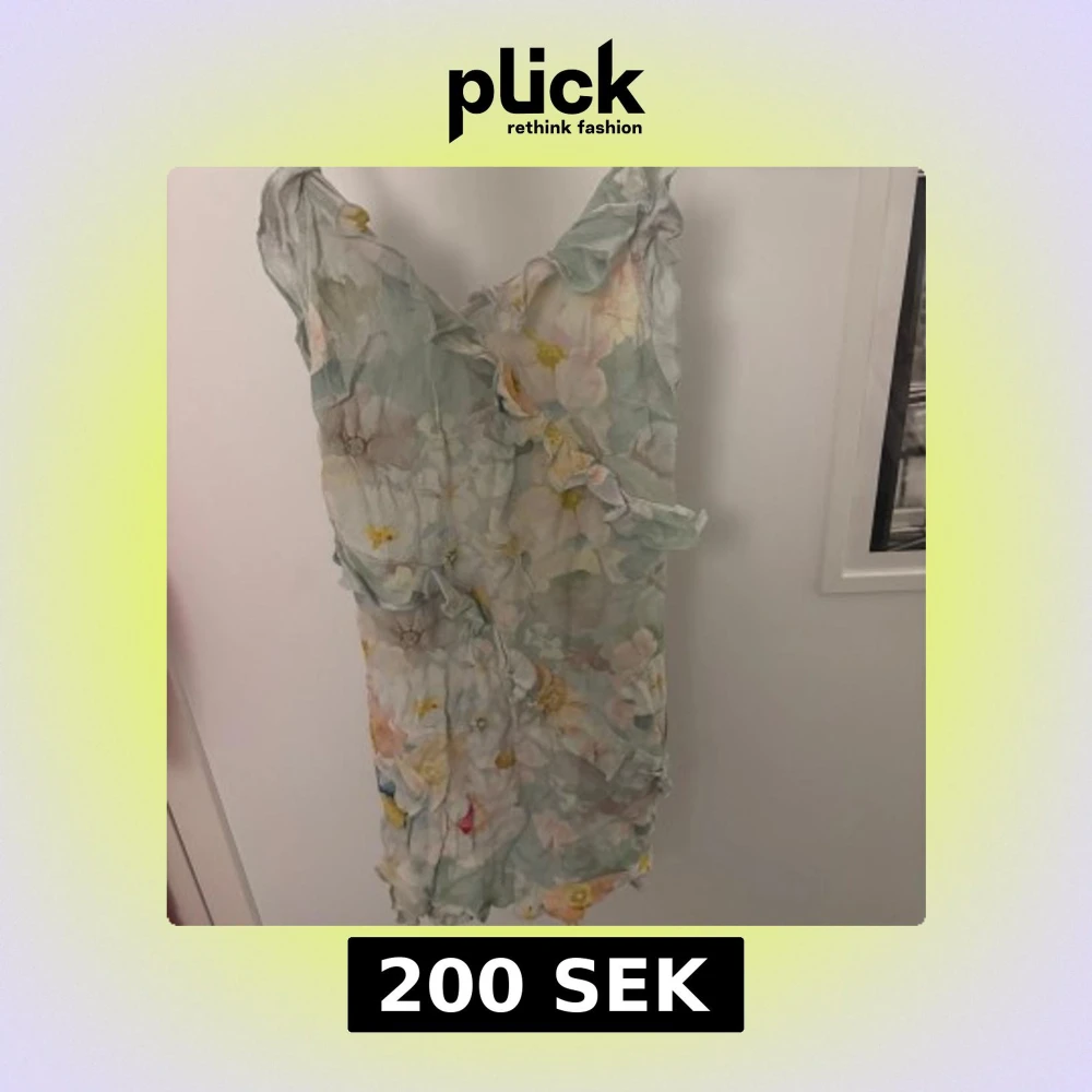Säljer en söt blommig klänning i pastellfärger med volangdetaljer och omlottkänsla. Klänningen är ärmlös med smala axelband och har en lätt och luftig känsla, perfekt för varma dagar. Skriv för fler bilder!!