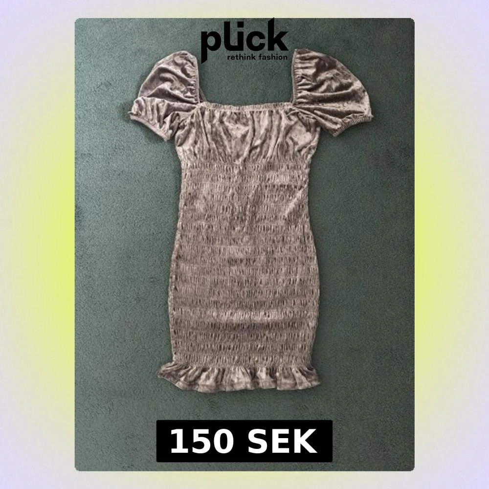 Supersöt kort grå klänning i mjuk sammet med puffiga kortärmar och smockad kropp. Klänningen har volangkant nertill som ger en trendig vibe. Perfekt för dig som vill sticka ut med en unik och bekväm stil. Använt endast en gång, inga slitage!