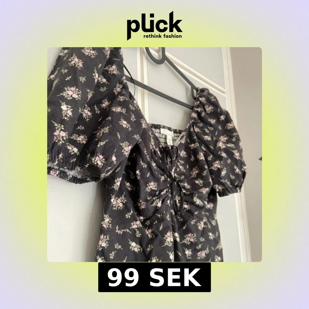 Supersöt svart klänning från H&M med små rosa och gröna blommor. Puffärmar och snörning framtill ger en fin touch. Tillverkad i linneblandning som känns lätt och skön.