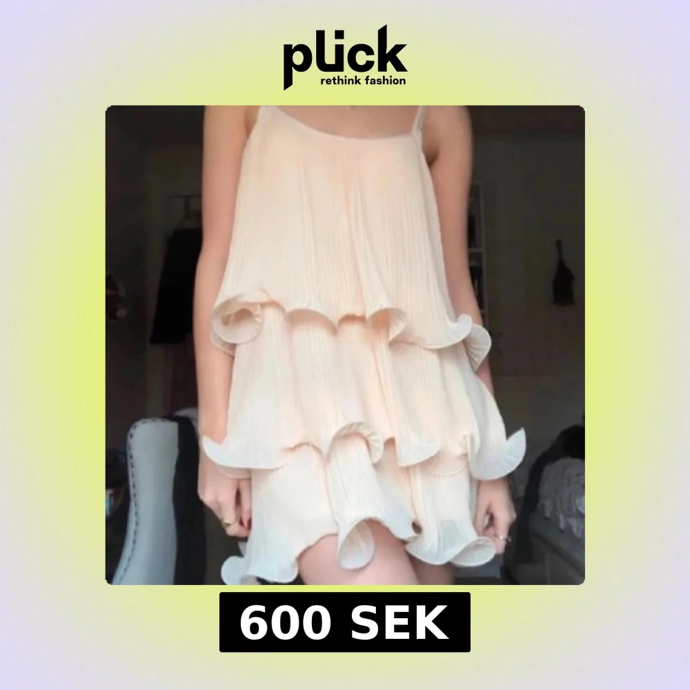 Supersöt ljusrosa klänning med tunna axelband och flera lager volanger. Klänningen är kort och har en luftig, flowy känsla – perfekt för varma dagar eller sommarens fester.