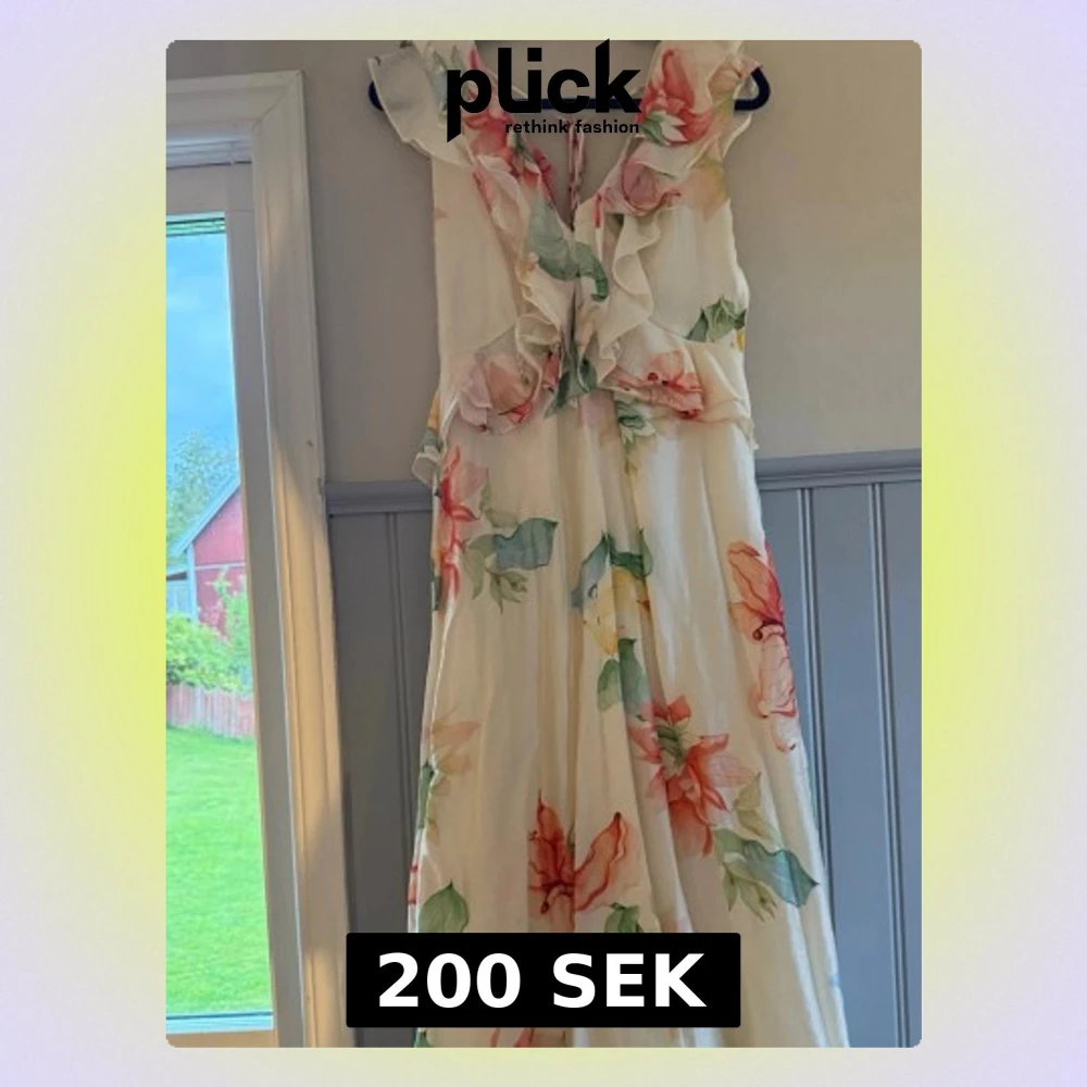Superfin långklänning i ljus bas med stora blommor i grönt, rött och orange. Klänningen har volangdetaljer vid axlar och byst, v-ringning och knyt i ryggen. Perfekt för sommarens alla tillfällen. Materialet känns lätt och luftigt. Använd fåtal gånger❤️🔥