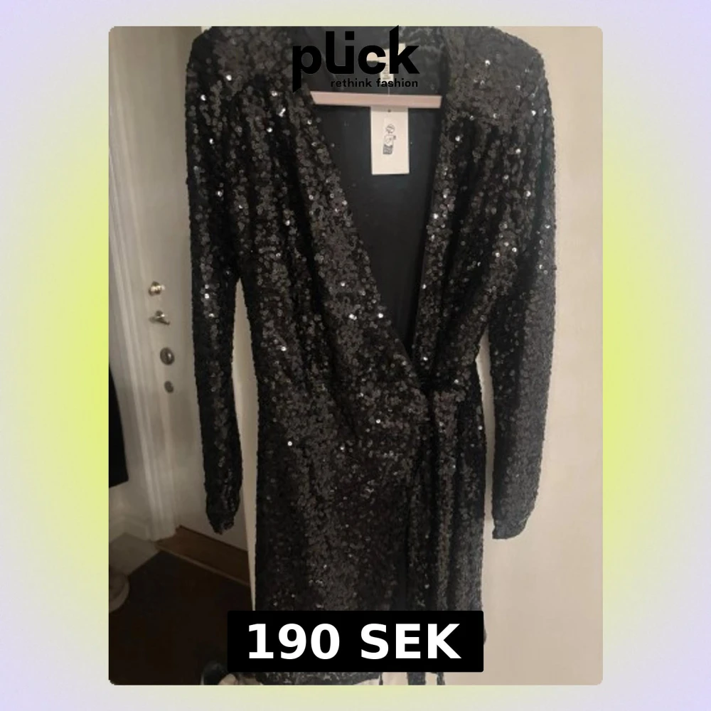 Säljer en svart omlottklänning från H&M täckt med glittriga paljetter. Klänningen har lång ärm, v-ringning och ett bälte i midjan för snygg passform. Perfekt för dig som vill sticka ut med en riktigt festlig look.