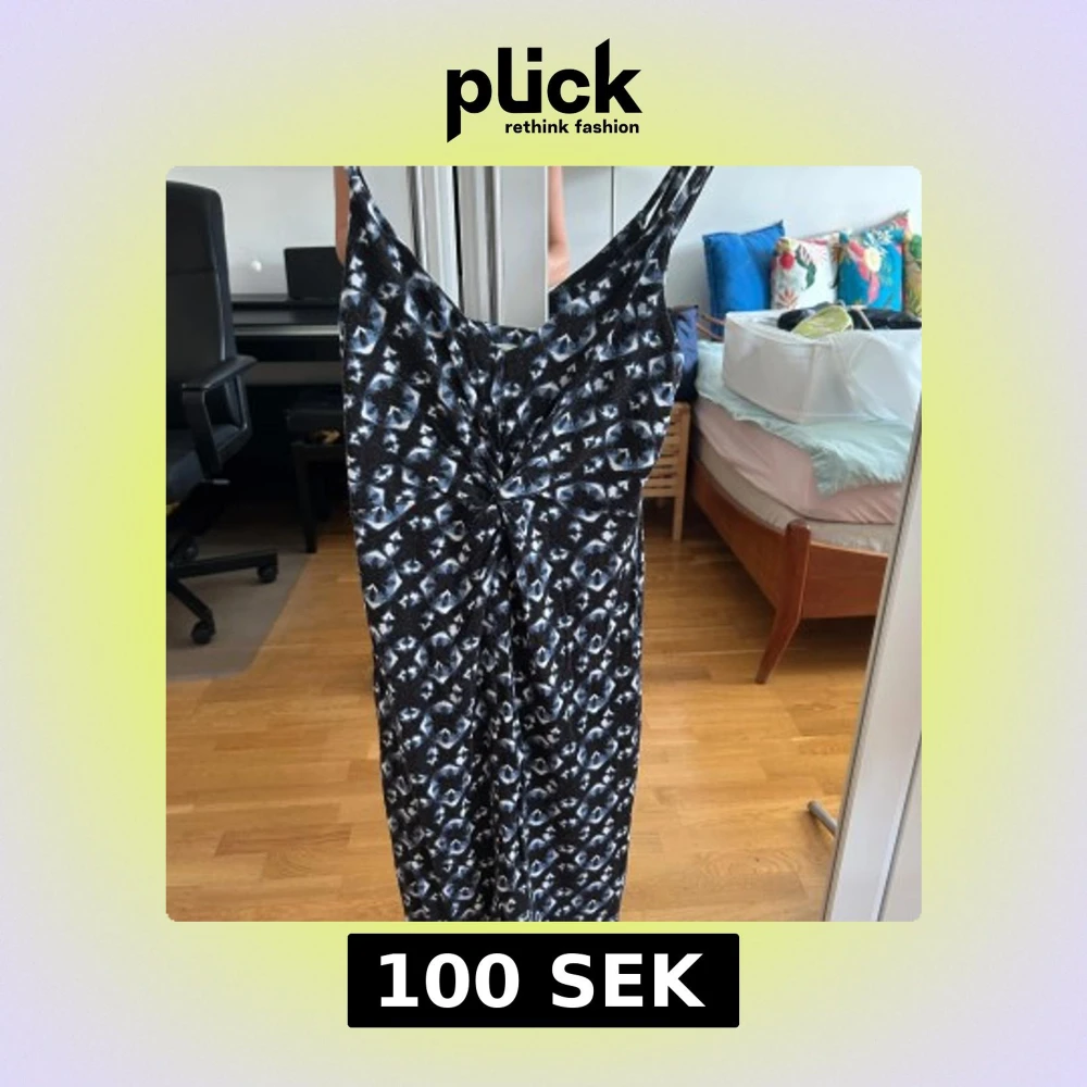 Säljer en långklänning från H&M i storlek S med svart och blått geometriskt mönster. Klänningen har smala axelband och en snygg twistad detalj framtill. Materialet är mjukt och stretchigt, perfekt för dig som gillar coola prints och bekväm passform.