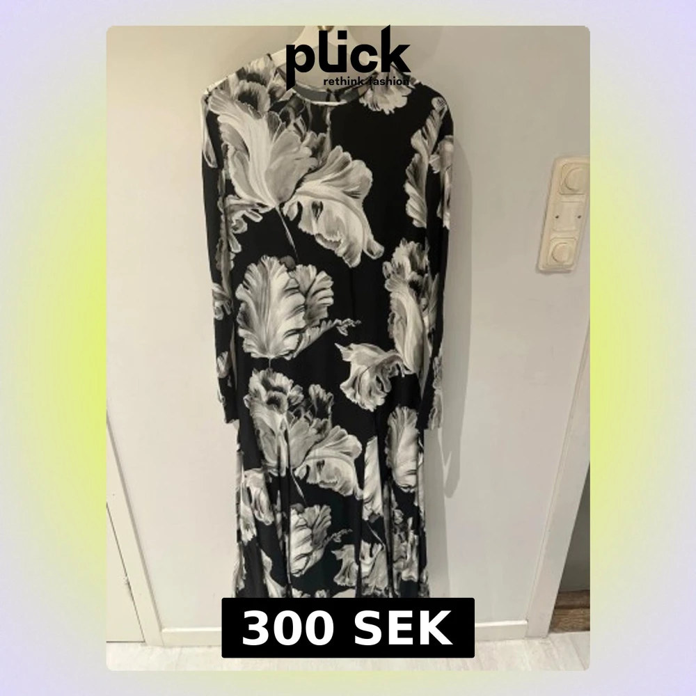 Svart långklänning med stora vita och grå blommor. Klänningen har lång ärm och rund halsringning. Tyget är mjukt och faller snyggt, perfekt för dig som gillar ett elegant och stilrent uttryck.