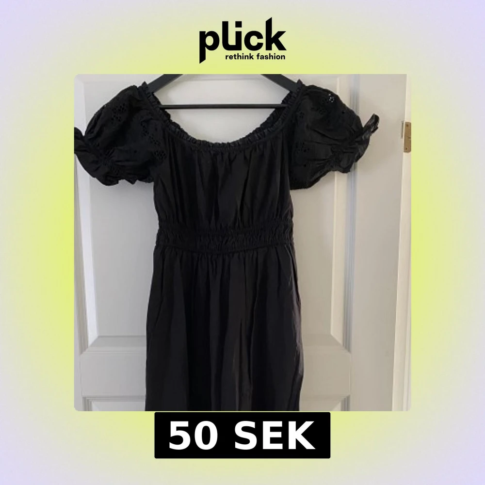 Supersöt svart lång klänning från H&M med puffiga kortärmar och broderade spetsdetaljer. Klänningen har resår i midjan och vid halsen för en bekväm passform. Perfekt för dig som gillar romantiska och trendiga plagg.